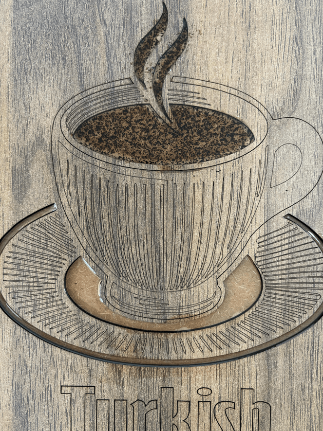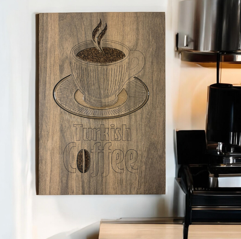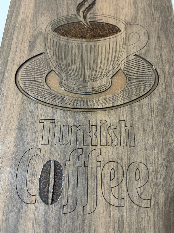 Lazer kesim, epoksi reçine ve kahve çekirdeği dokusuyla tamamlanan bu tasarım, kahve severlerin mutfağına ve keyif köşelerine cuk oturur. ?Türk kahvesi olmadan güne başlayamıyorum? diyenlerin gururla sergileyeceği bir parça!