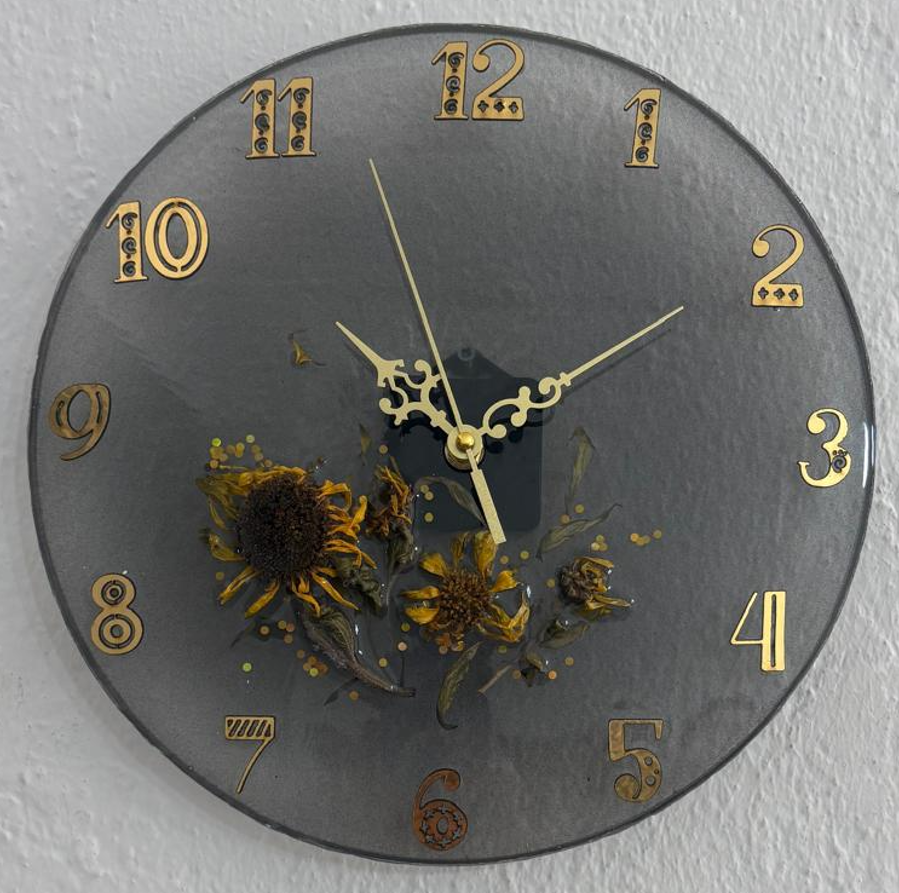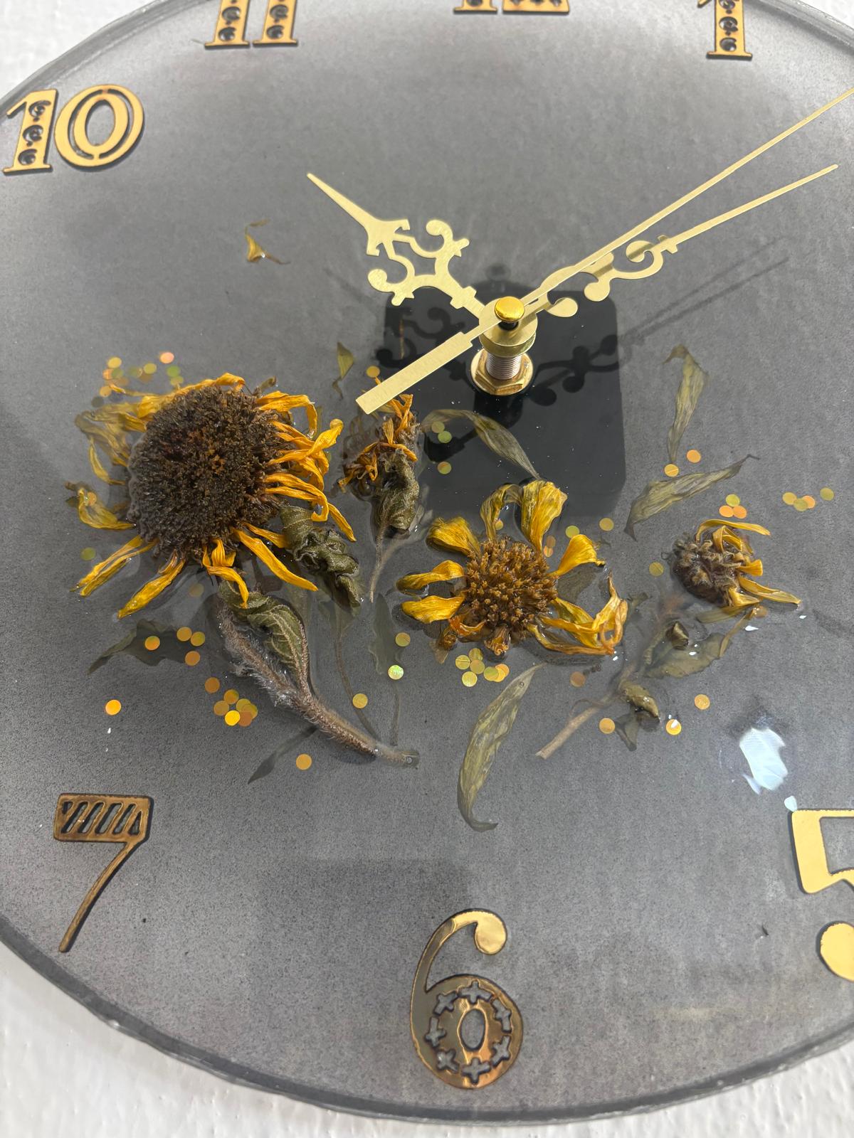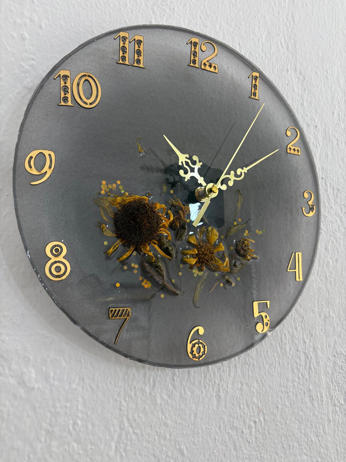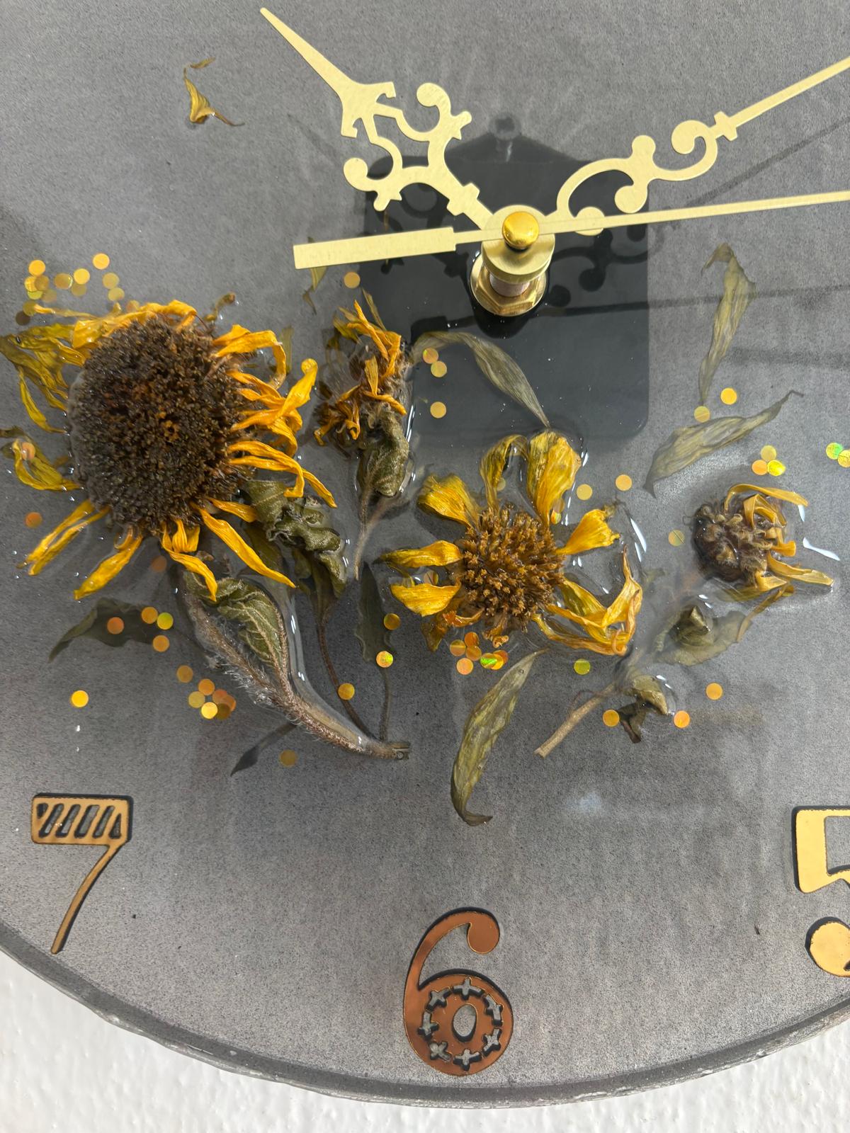 PELİNCE - Ayçiçeği Figürlü Gold Detaylı Epoksi Duvar Saati (Özel Tasarım - Tek Üretim) - 30 cm
