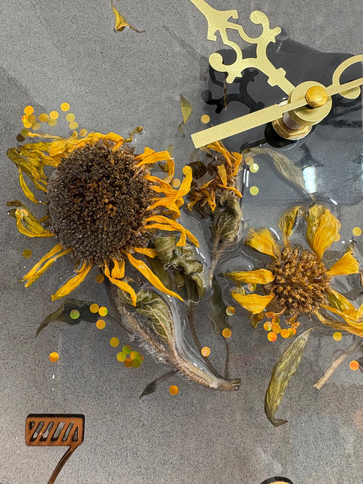 Ayçiçeğinin güneşe dönme huyu meşhur. Ama işin komiği burada güneşe değil, doğrudan sana bakıyor. Epoksinin içinde “artık patron sensin” diye sabitlenmiş durumda.