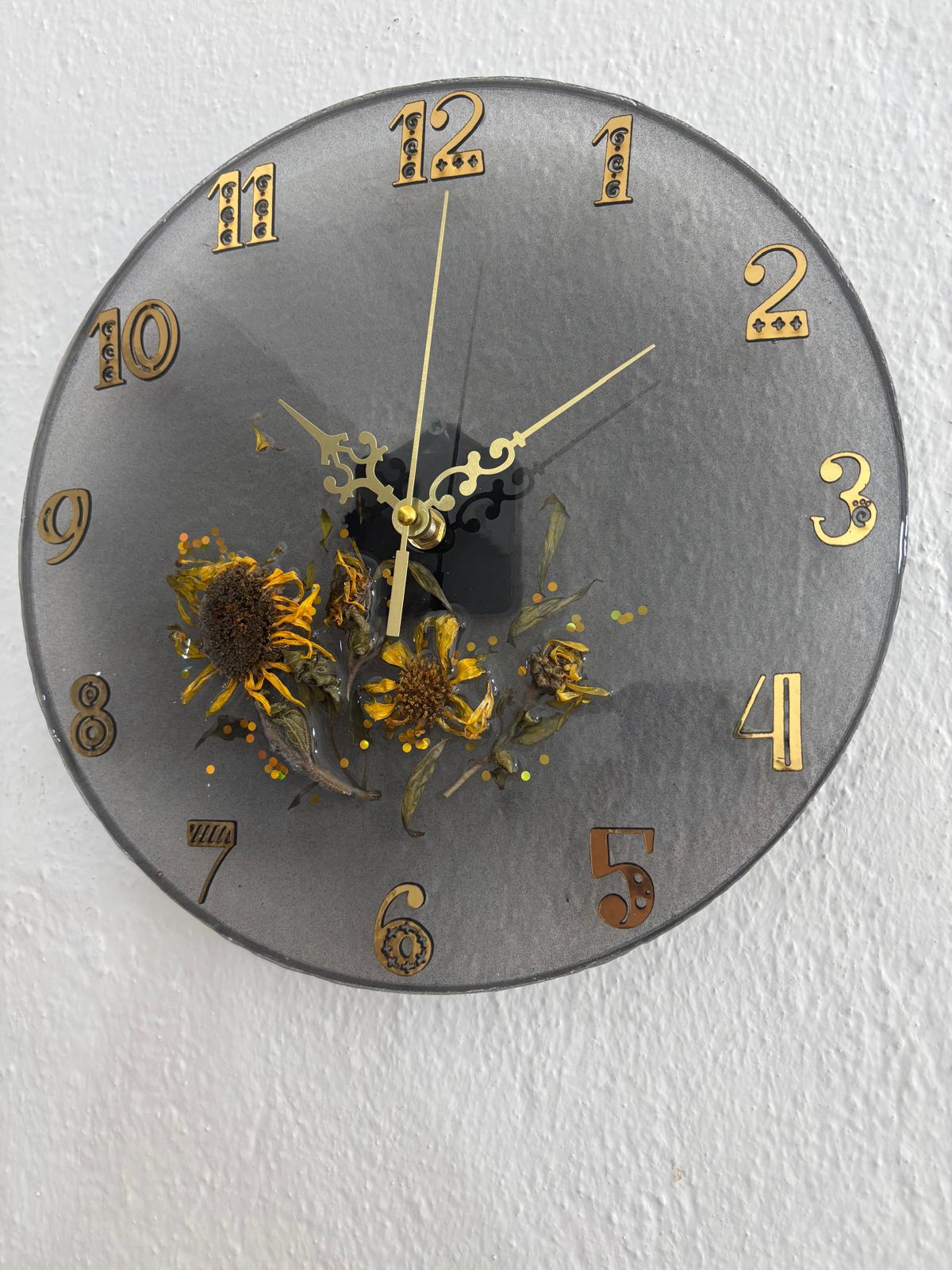 Gold renkteki rakamlar ve akrep-yelkovan, çiçeklerin sarısıyla uyumlu bir bütünlük veriyor. Hem modern hem de doğal görünüyor. Işık vurdukça metalik detaylar parlıyor, gözünü alan ama gözü yormayan bir şıklık var.
