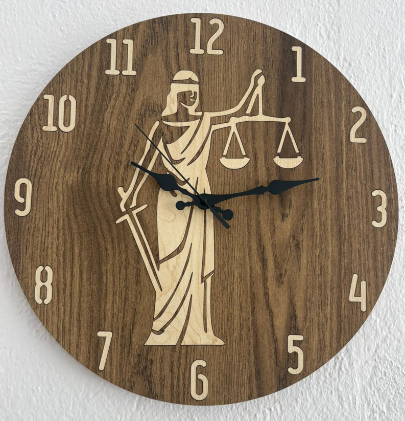 Üzerindeki figür Justitia – yani Roma’nın adalet tanrıçası. Elinde terazi , gözleri bağlı. Mesaj net: “Adalet kördür, herkese eşit davranır.” Rakamlar da ahşap gövdeye işlenmiş, net ve okunaklı.