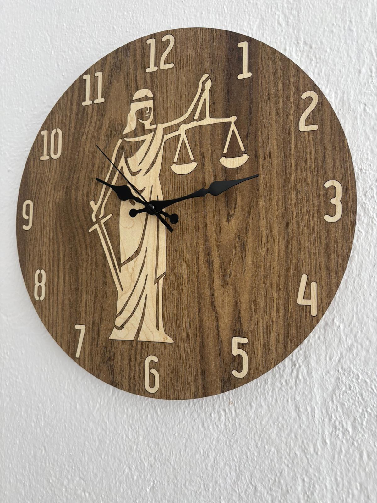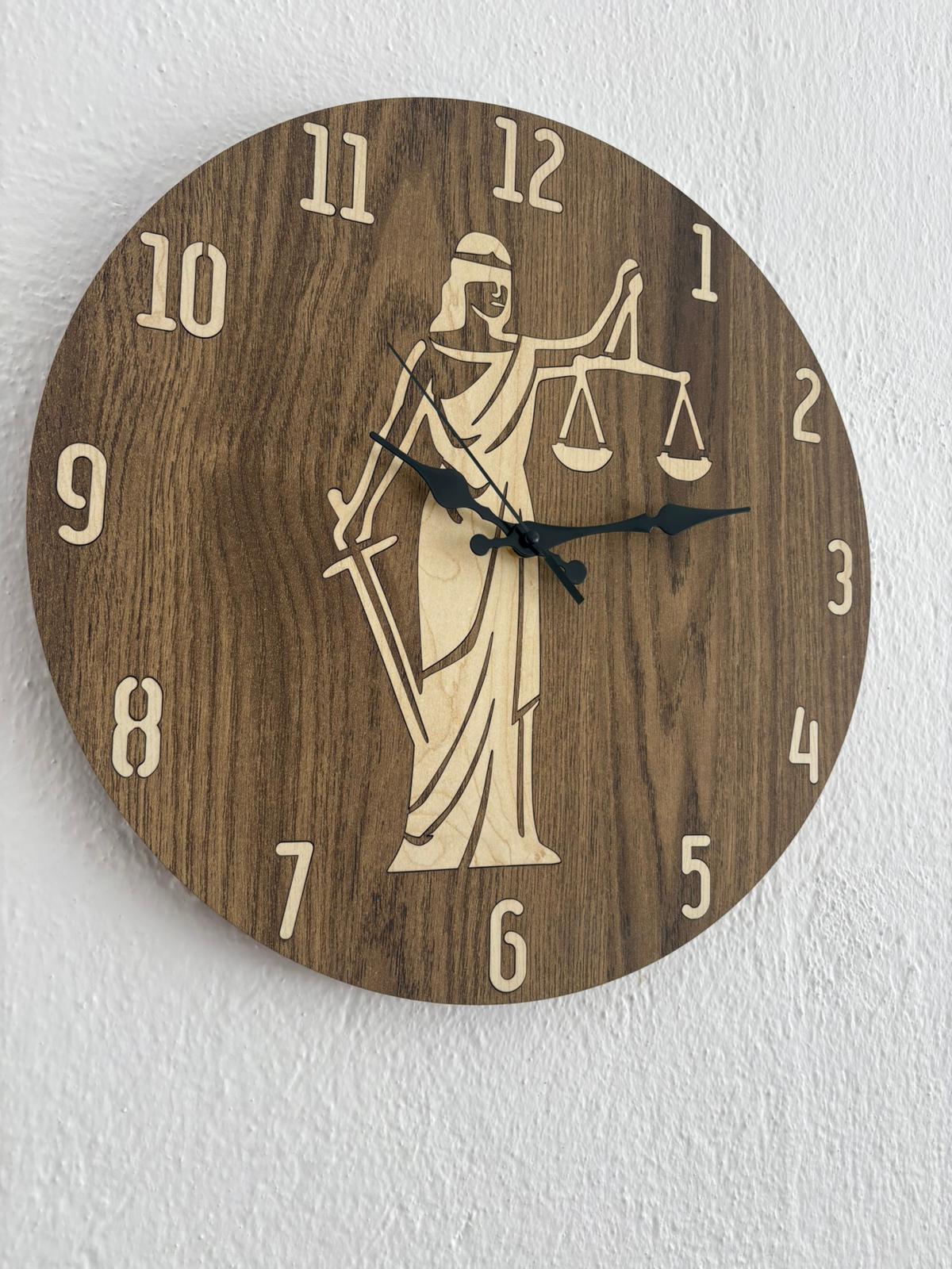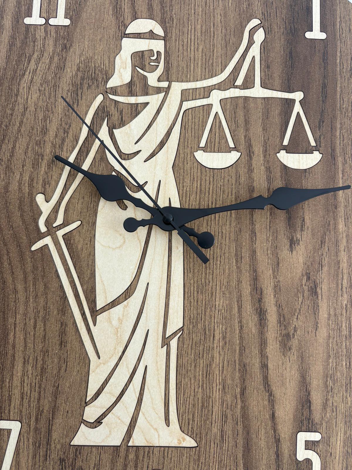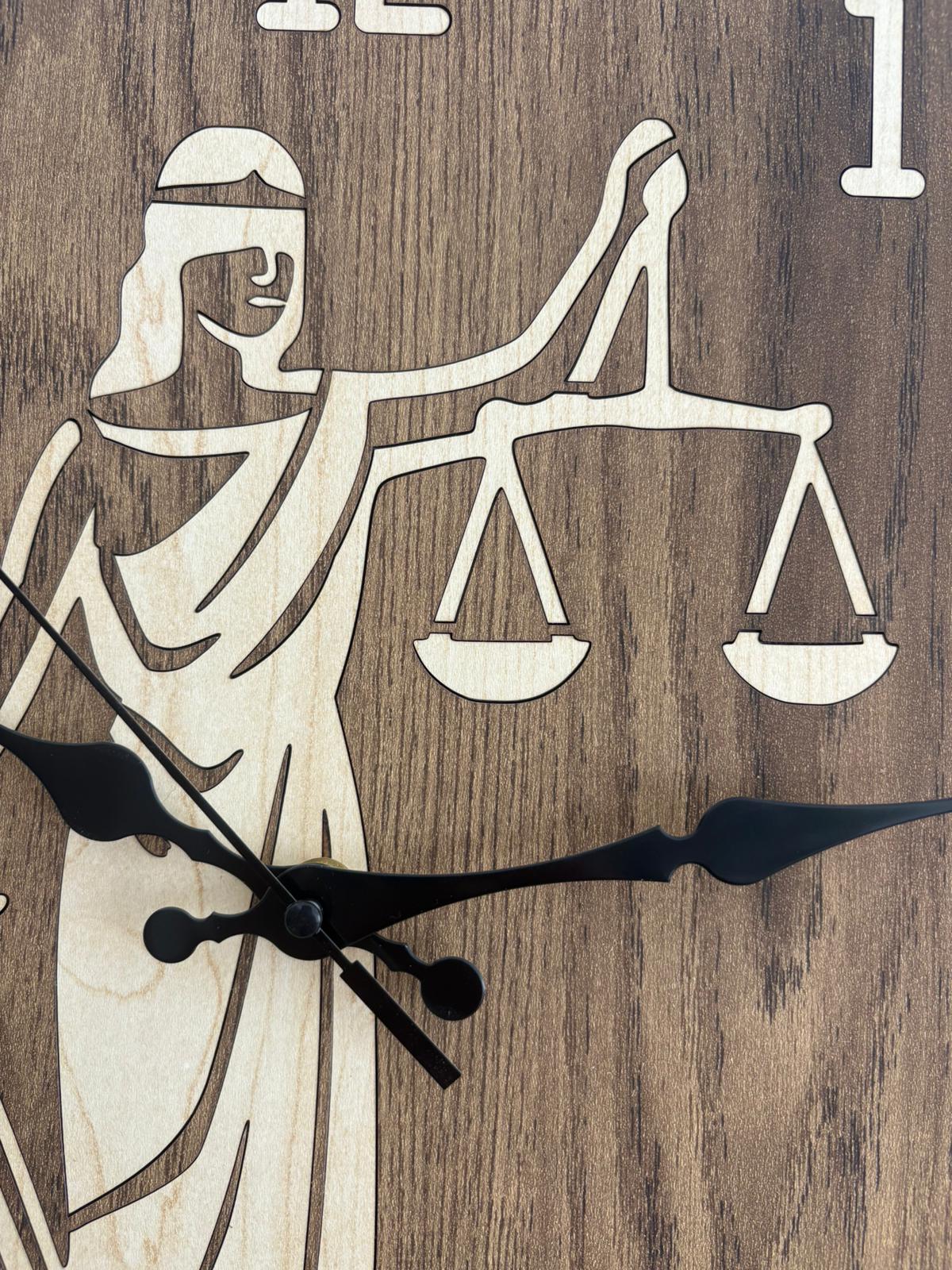 PELİNCE - Justitia Adalet Terazisi Figürlü Ahşap Duvar Saati (Kişiselleştirilebilir - Koyu Ahşap) - 40 cm