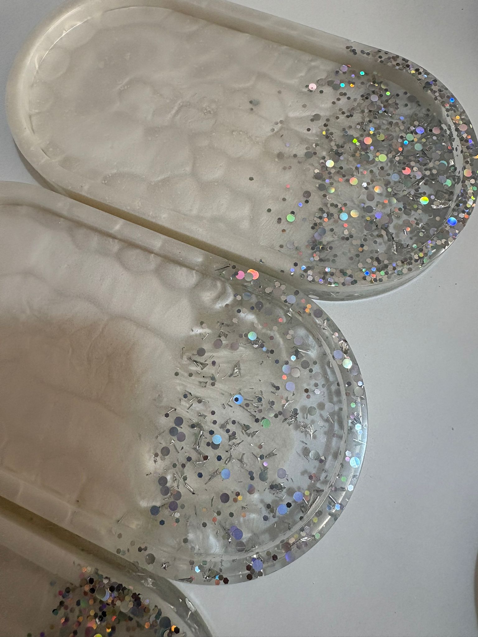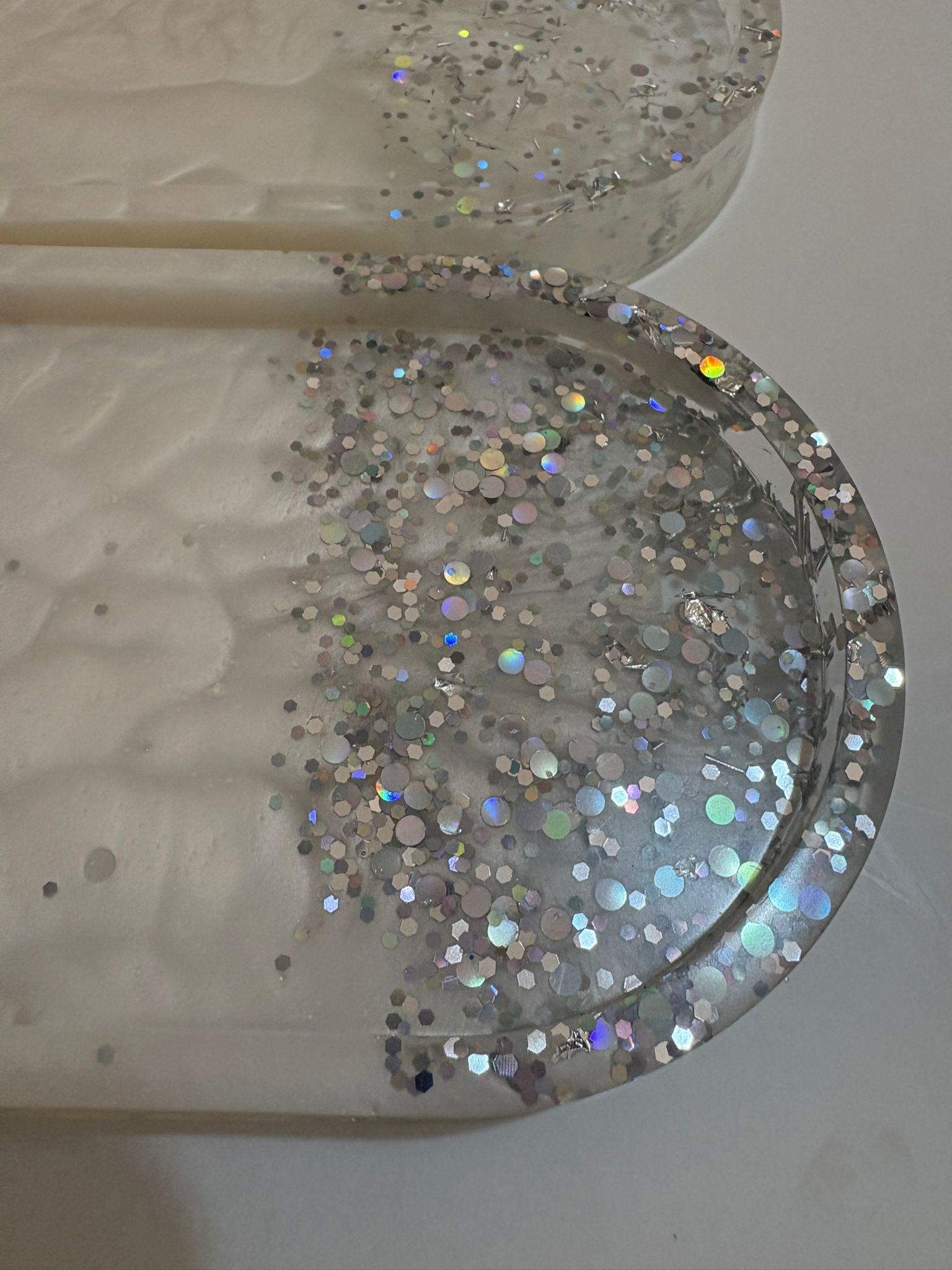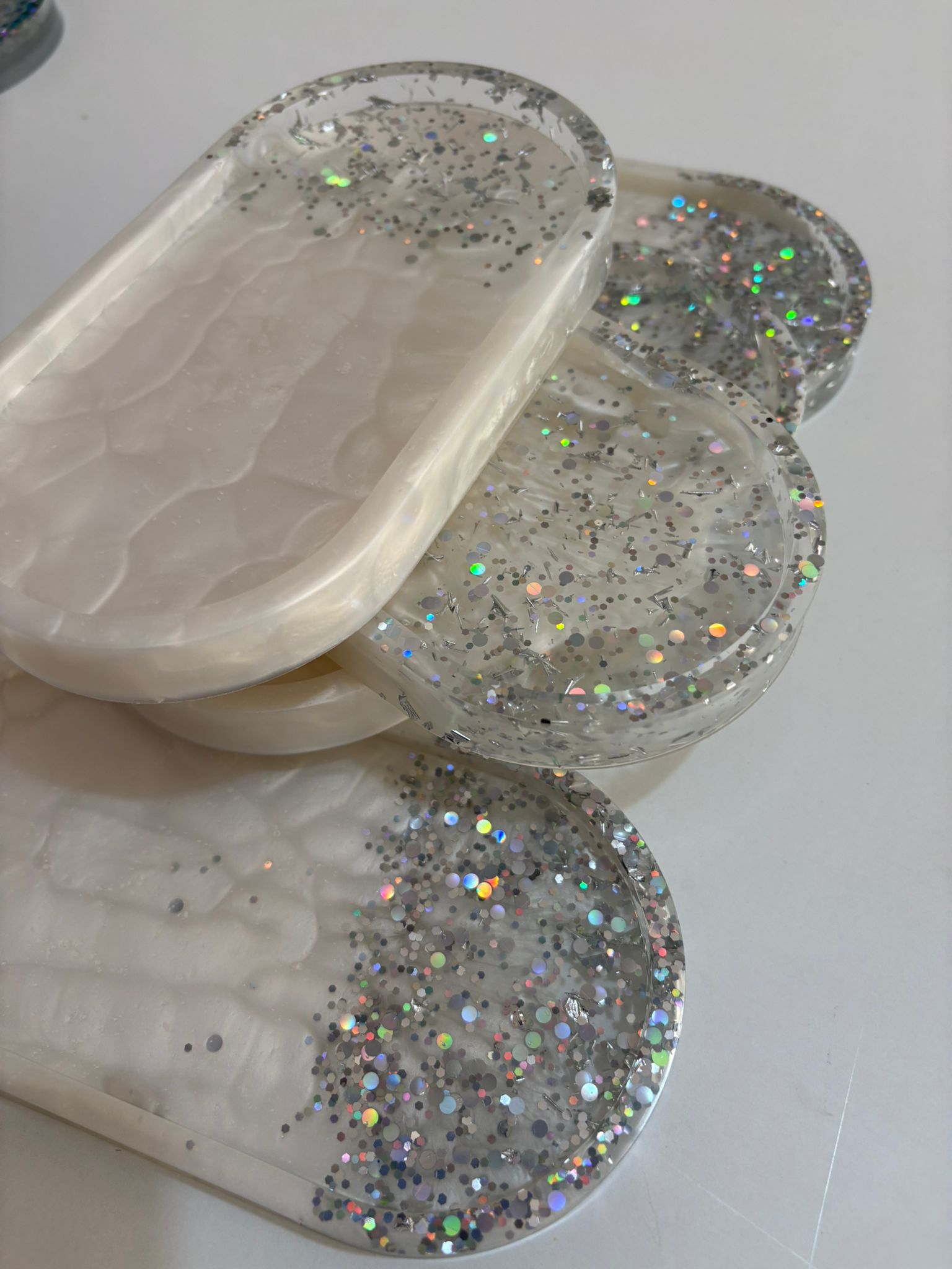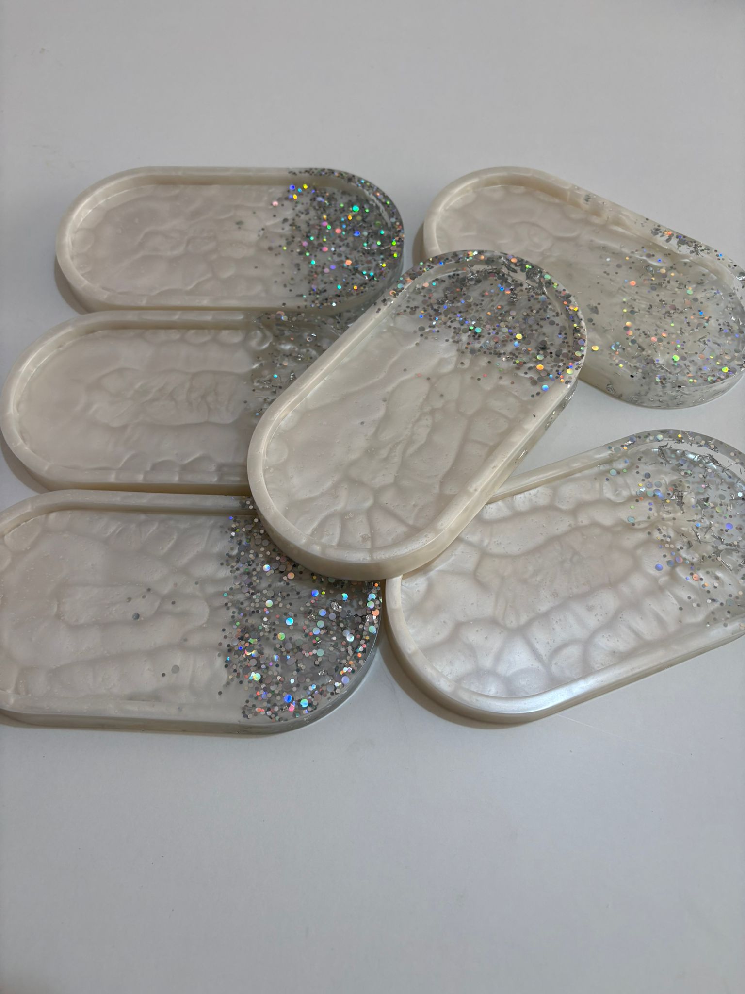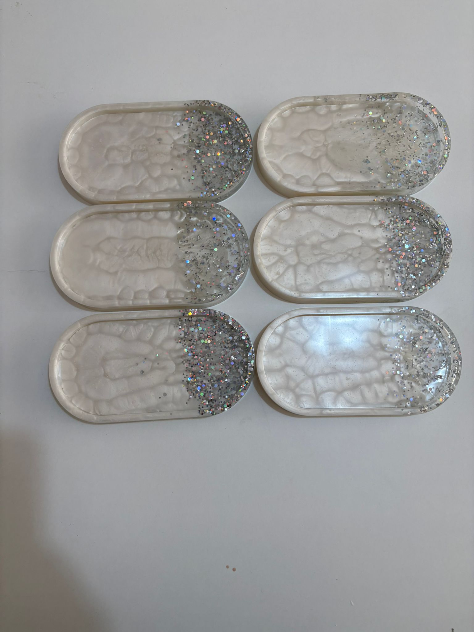 PELİNCE - El Yapımı 6'lı Epoksi Sunumluk - İnci Beyazı Gümüş Glitter & Varaklı - Ebatları: 17,5 x 9,5 cm