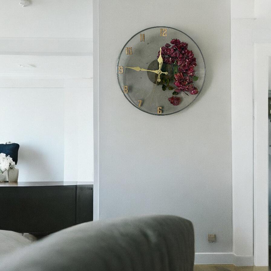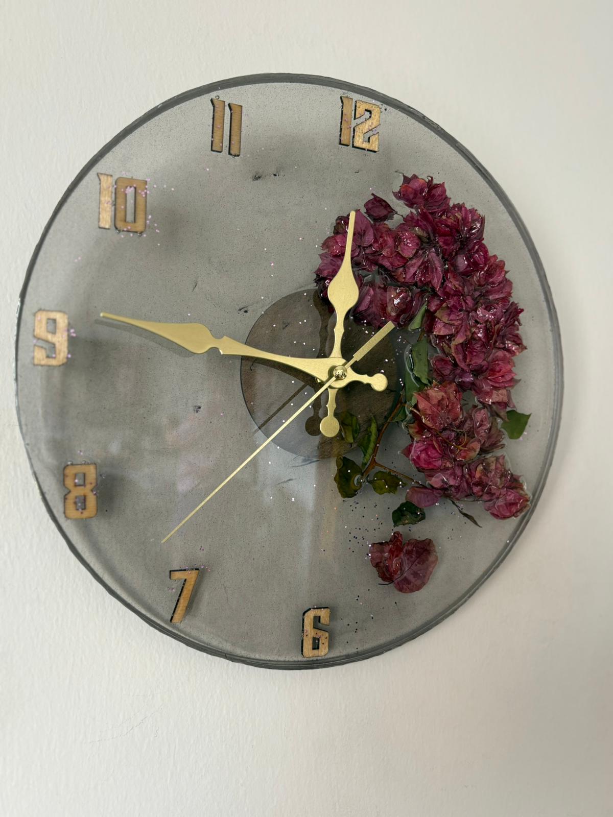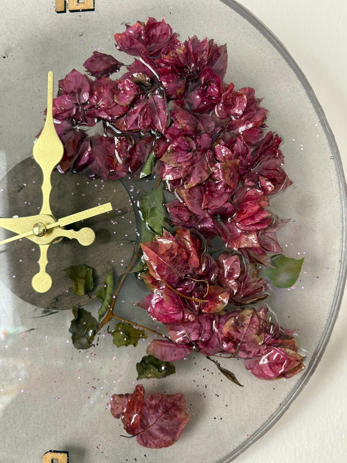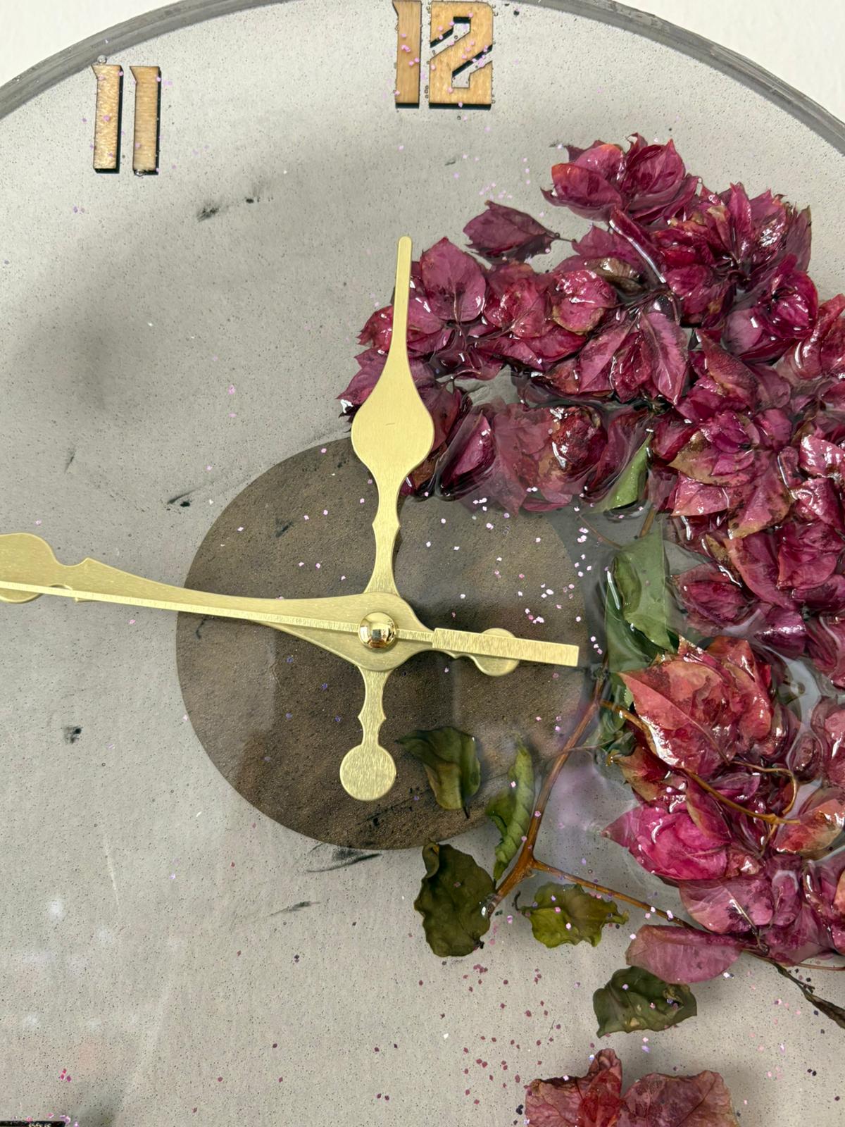 Eğer zaman bir çiçekse, bu saat onun en olgun halidir. 30 cm çapında, tamamı epoksi dökümden oluşan bu tasarım, içinde gerçek begonya yaprakları taşıyor. Ama öyle sahte süs değil; bu yapraklar saatten dışarı doğru çıkıyor, adeta "beni doğadan zorla kopardılar ama hâlâ buradayım" diye bağırıyor.