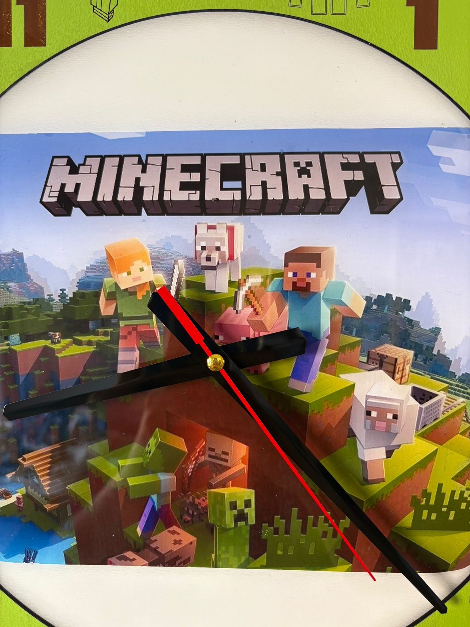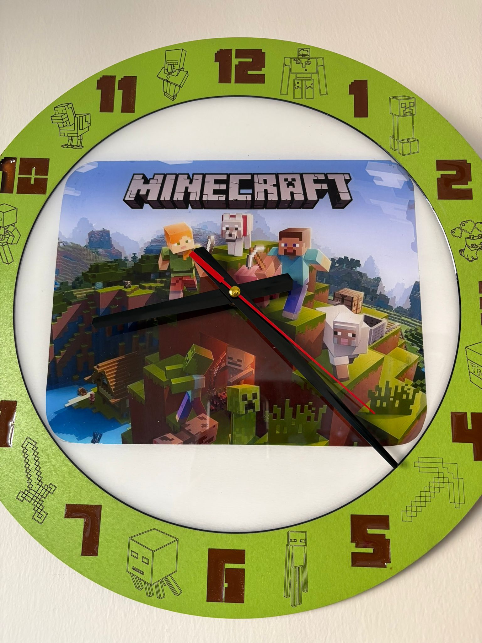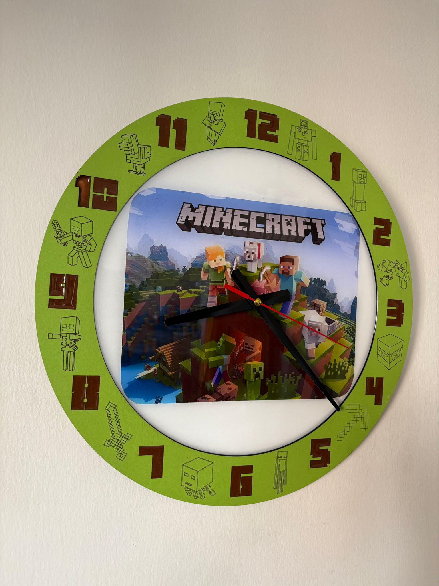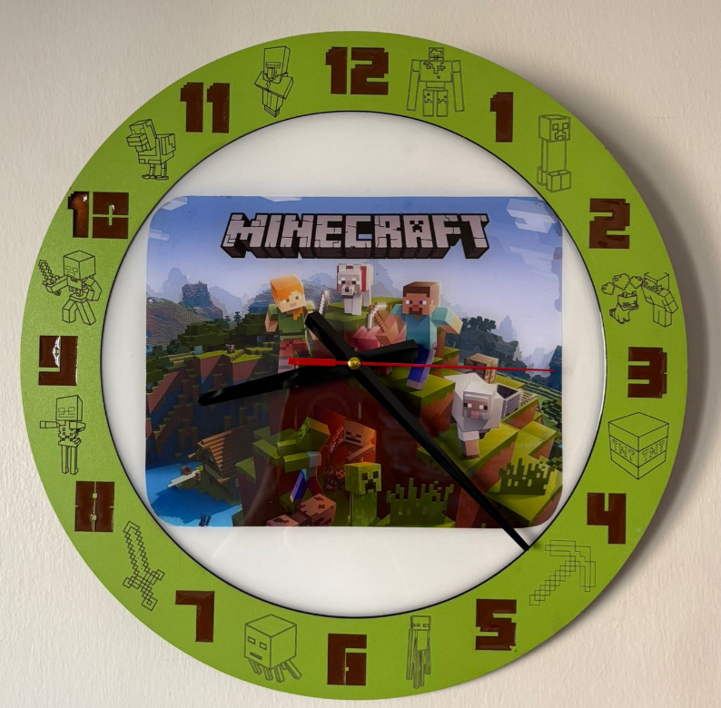İnşa et, kaz, keşfet, ama önce bu saate bir göz at! Minecraft tutkunları için özel olarak hazırladığımız bu 40 cm?lik dev saat, iki katmanlı kontraplaktan üretildi. Saatin merkezinde, Minecraft evreninin en bilinen karakterleri şeffaf epoksi altında pusuya yatmış durumda. Çerçevesindeki kahverengi yeşil kombinasyonu ve lazerle işlenmiş figürler tam bir görsel şölen. Sayılar mı? Onlar da renkli epoksiyle dolu ve gözünüze gözünüze geliyor!