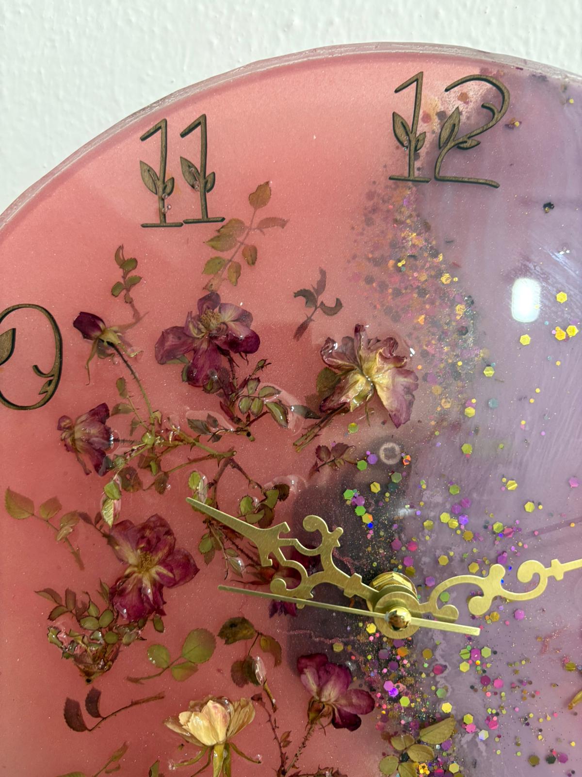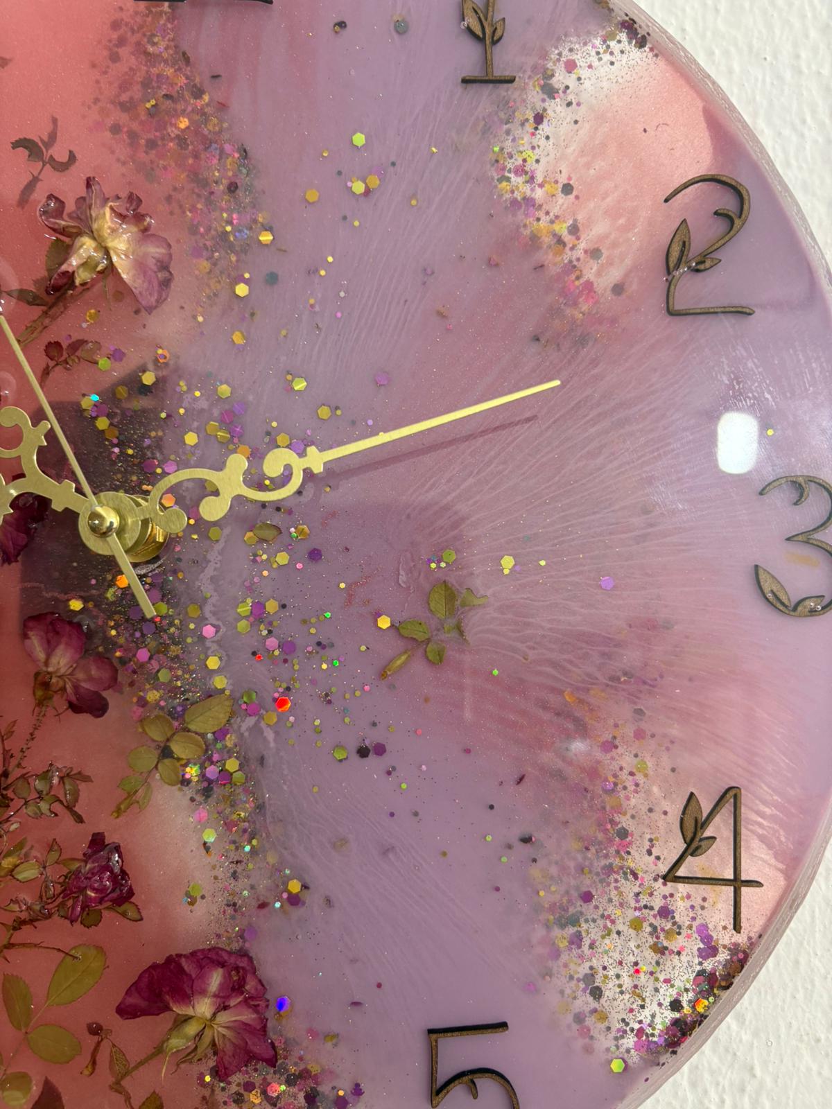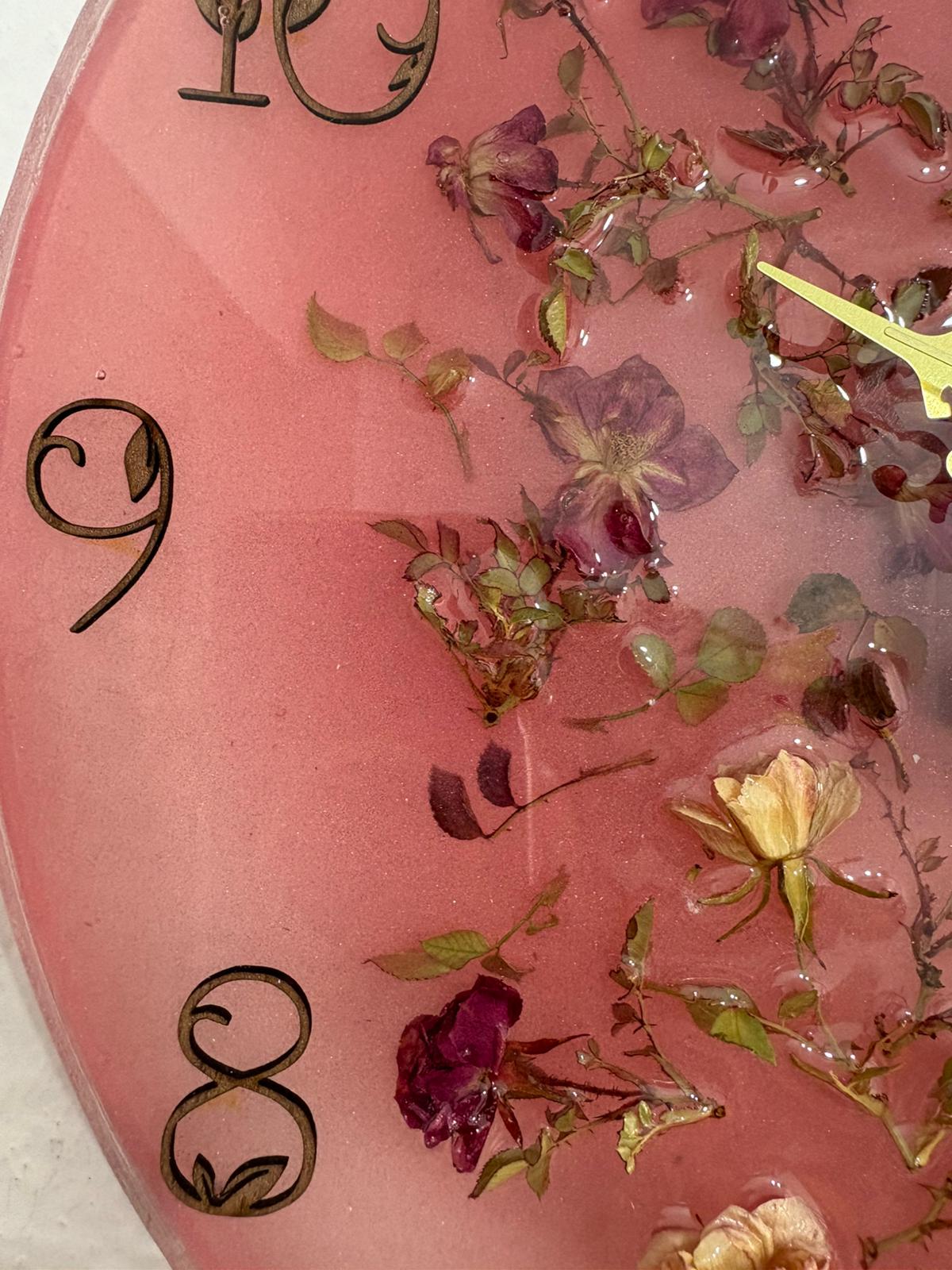 PELİNCE - Pembe Mor Tomurcuk Güllü Epoksi Duvar Saati (Özel Tasarım - Tek Üretim) - 30 cm