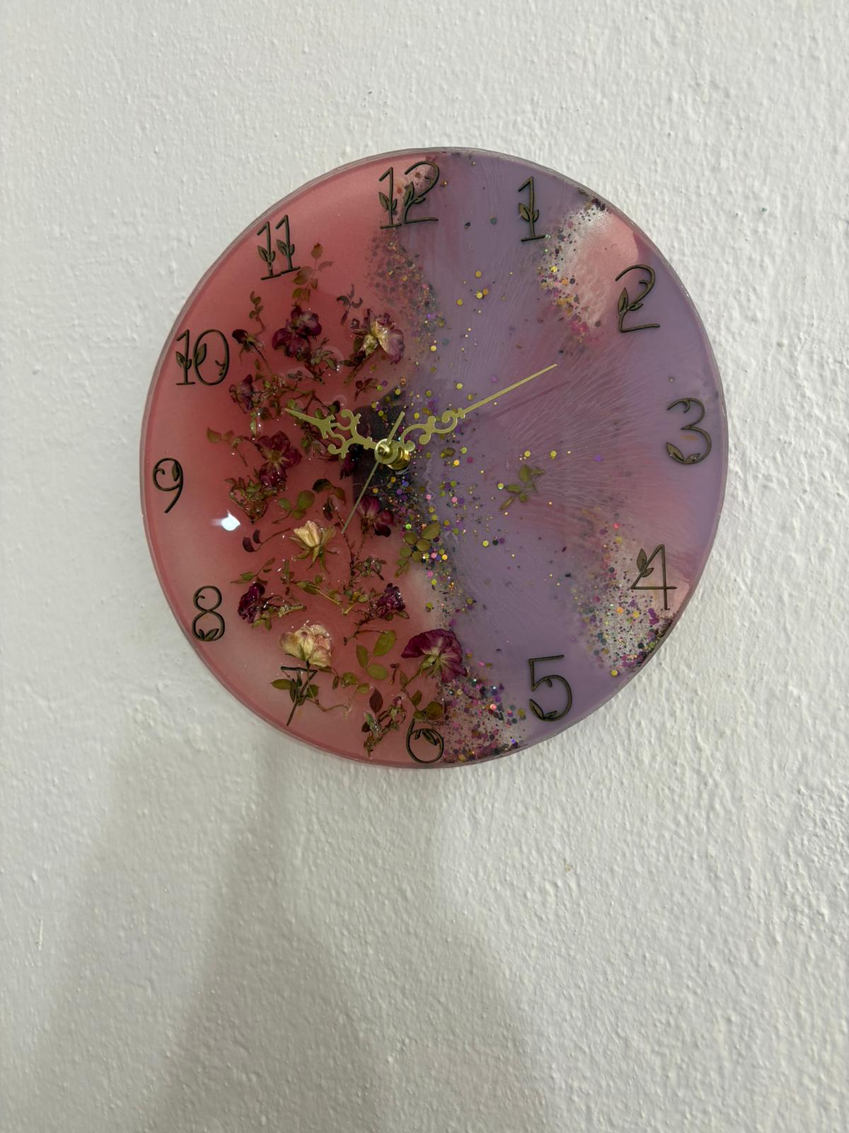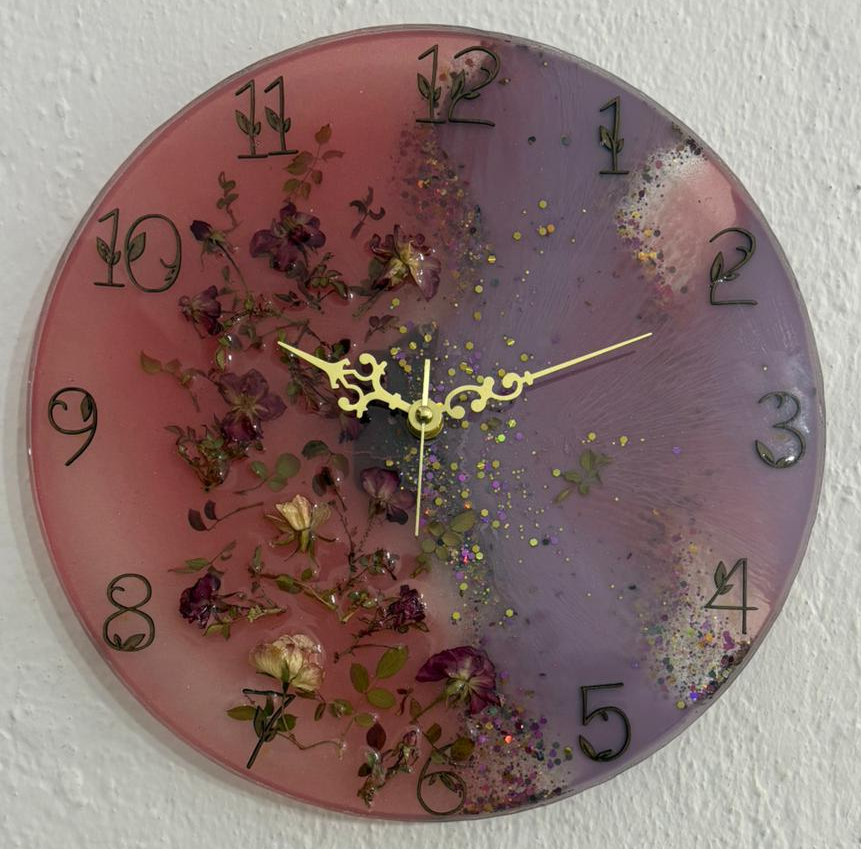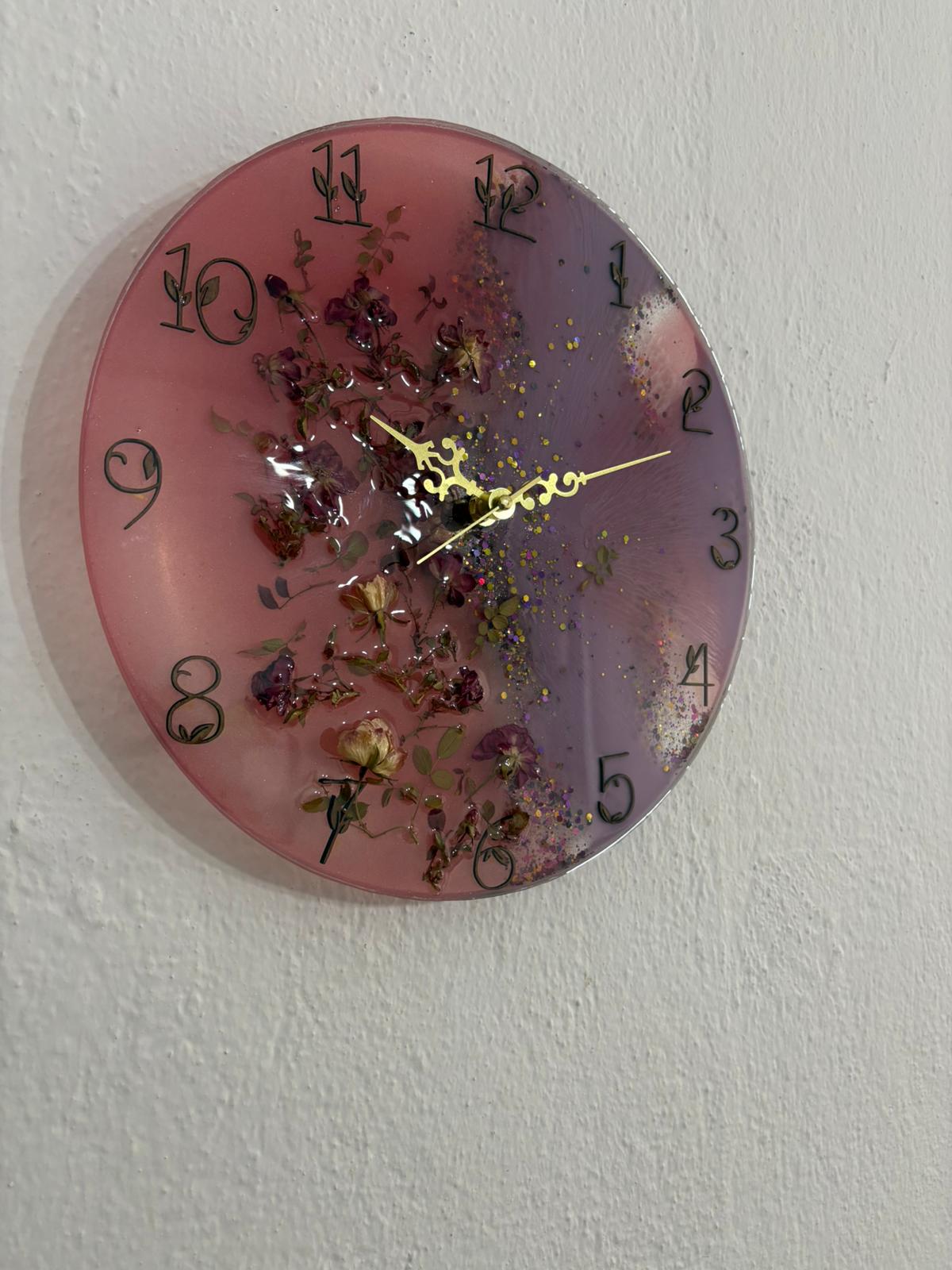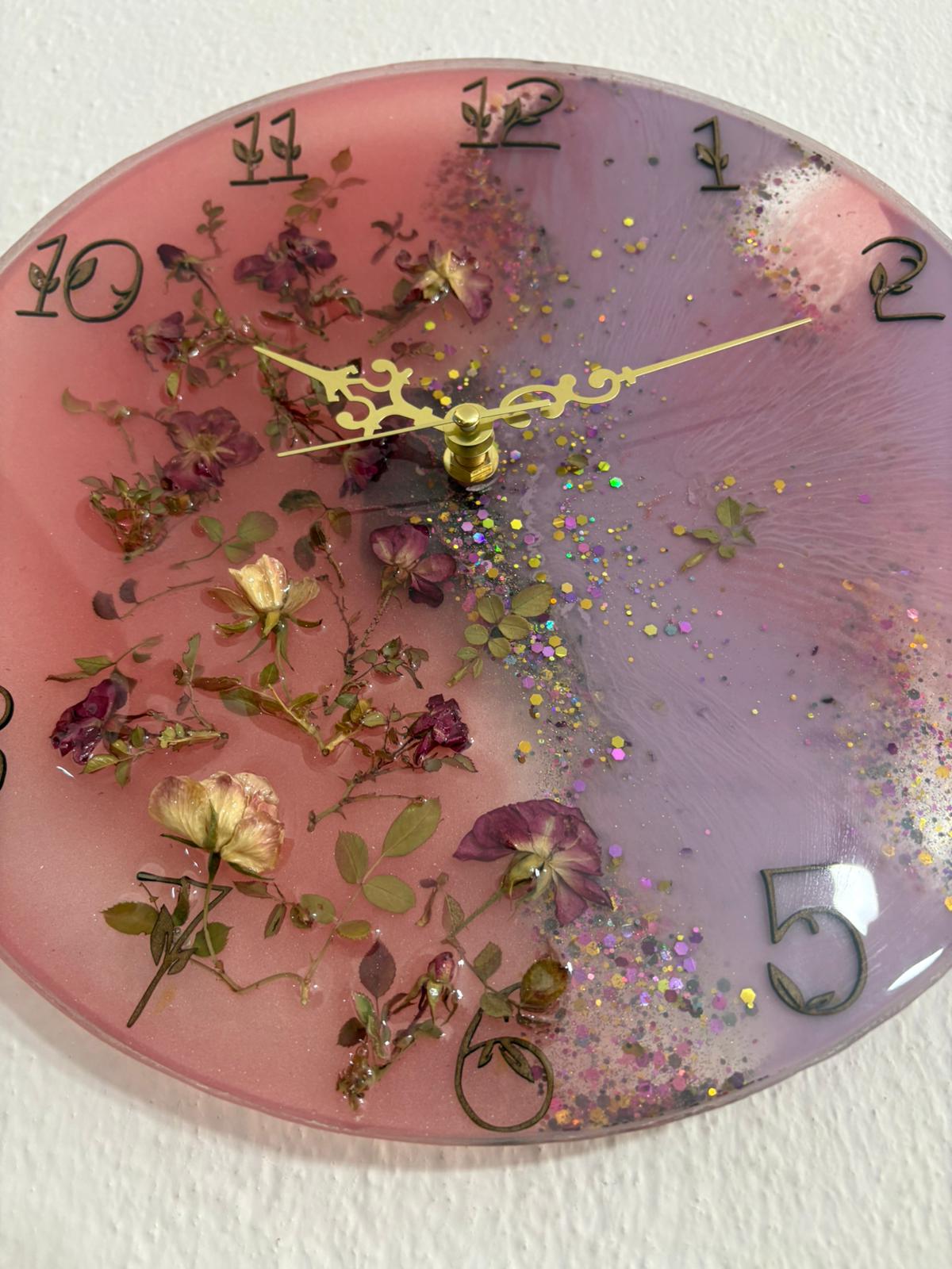 PELİNCE - Pembe Mor Tomurcuk Güllü Epoksi Duvar Saati (Özel Tasarım - Tek Üretim) - 30 cm