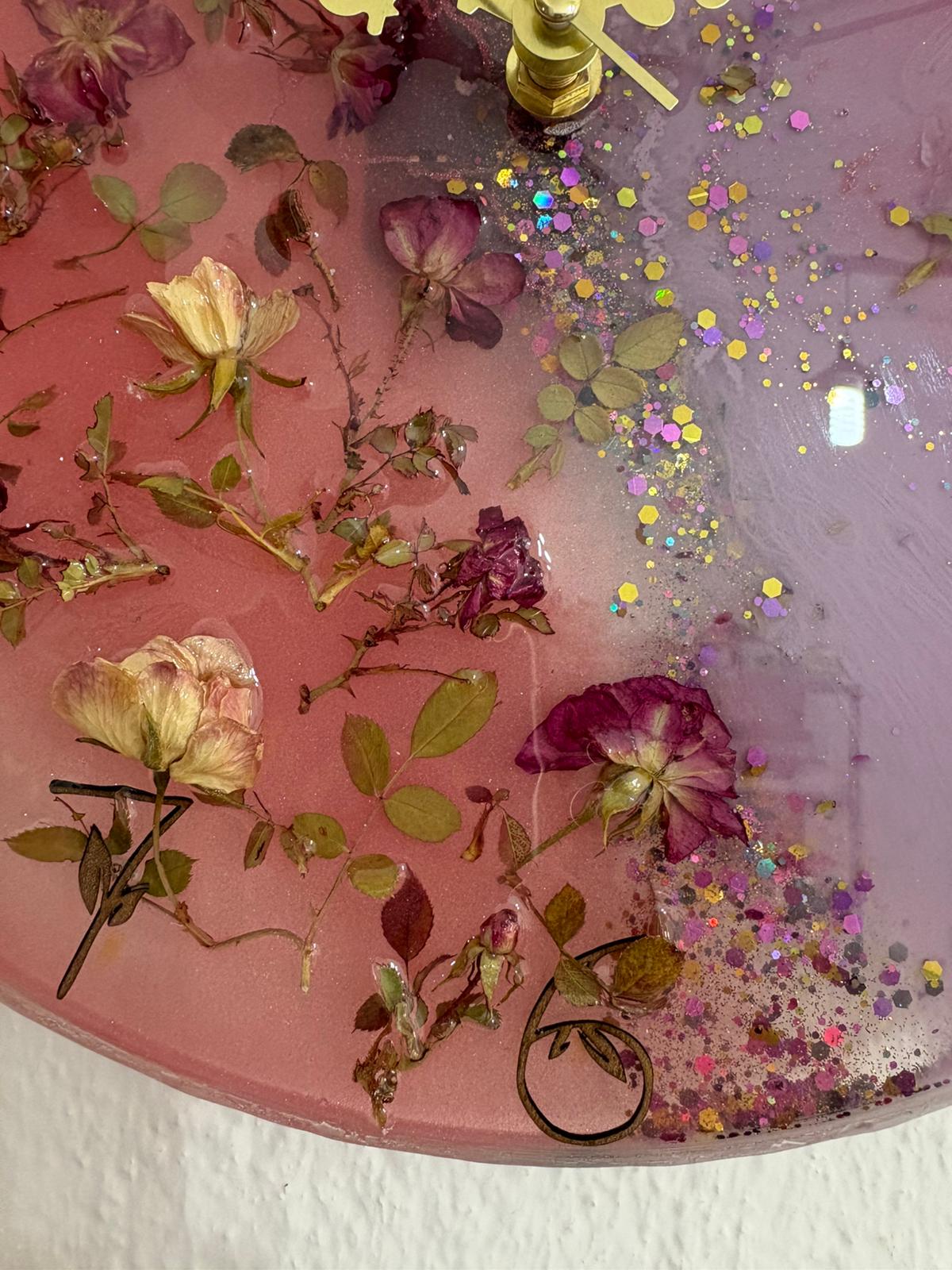Pembe ve mor epoksi zeminde donmuş gibi duran minik tomurcuk güller… Aralarda yapraklar, sim serpiştirmeleri ve tatlı bir renk oyunu. Yani baktıkça şeker gibi görünen bir tasarım.