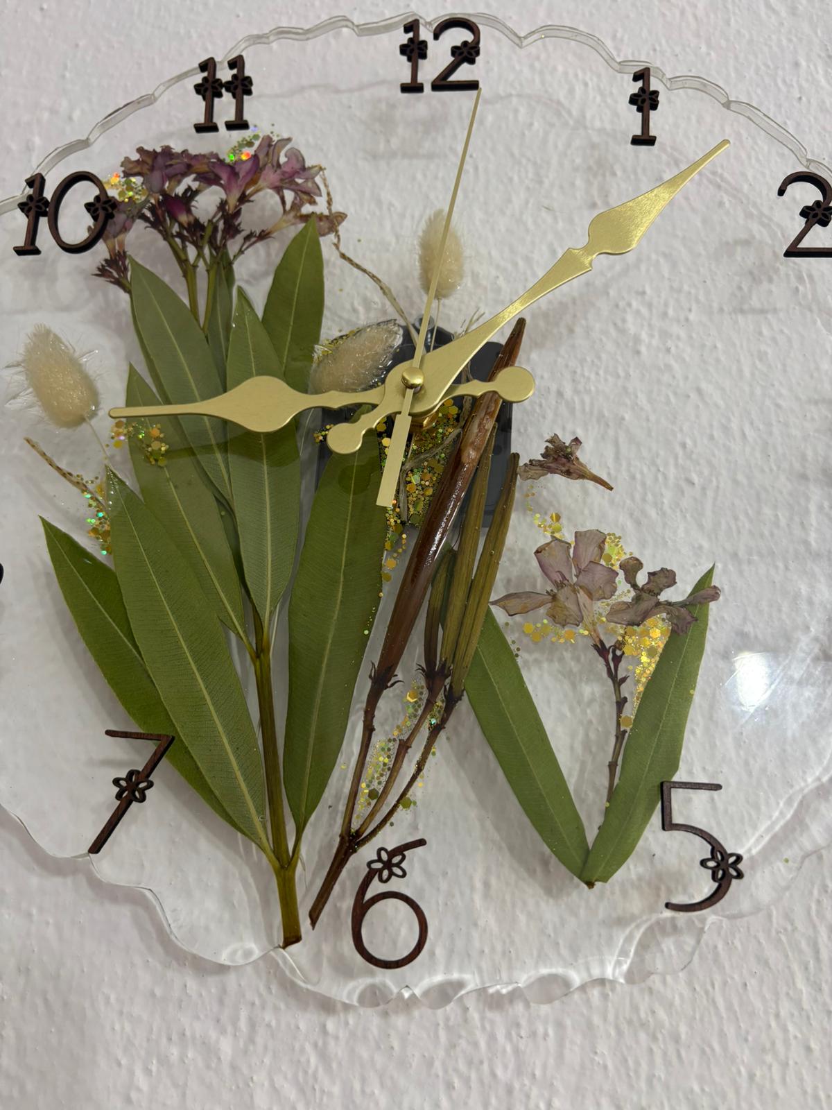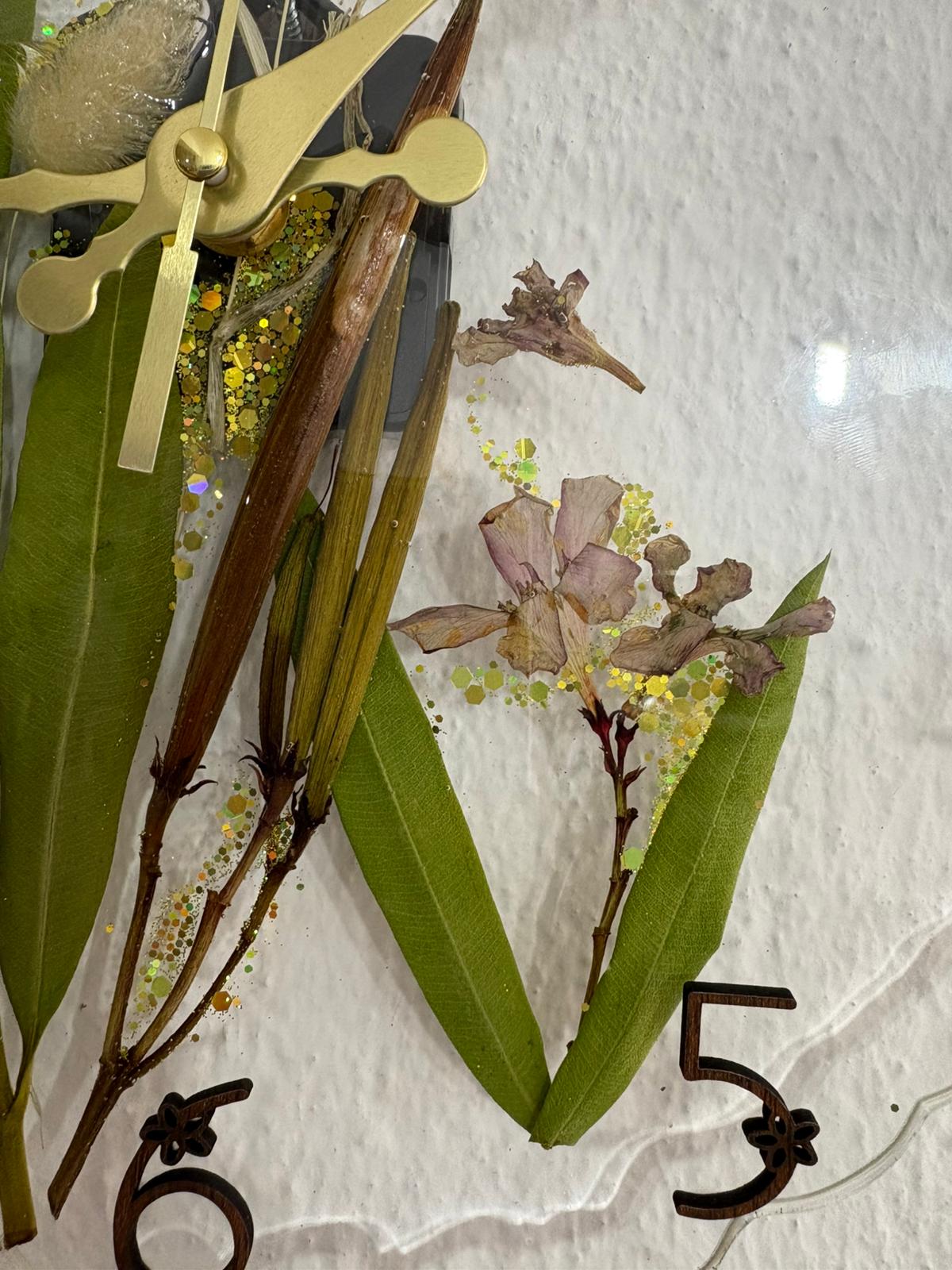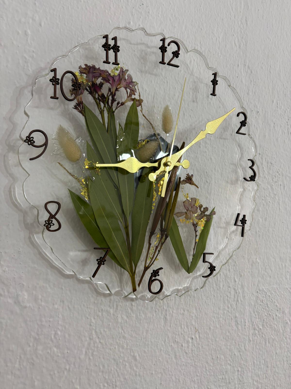 Gerçek zakkum çiçekleri bu saatin içine hapsoldu. Normalde bahçede görsen ?aman dokunma, zehirli? diye uzak durursun ama epoksinin içinde olunca tek zararı zamanı göstermek oluyor.