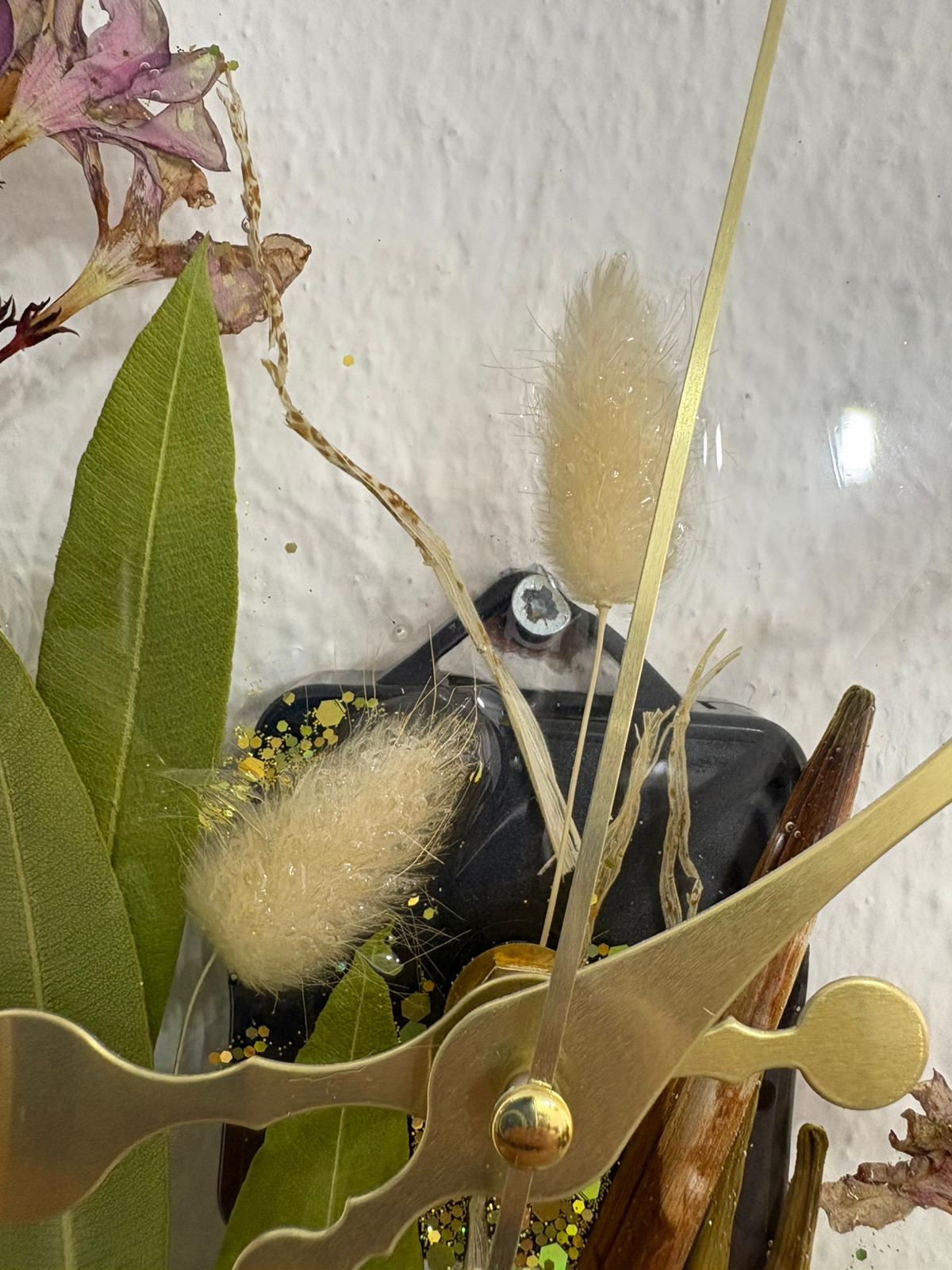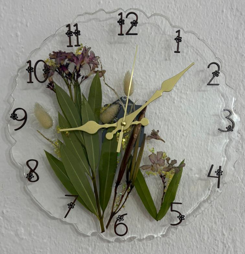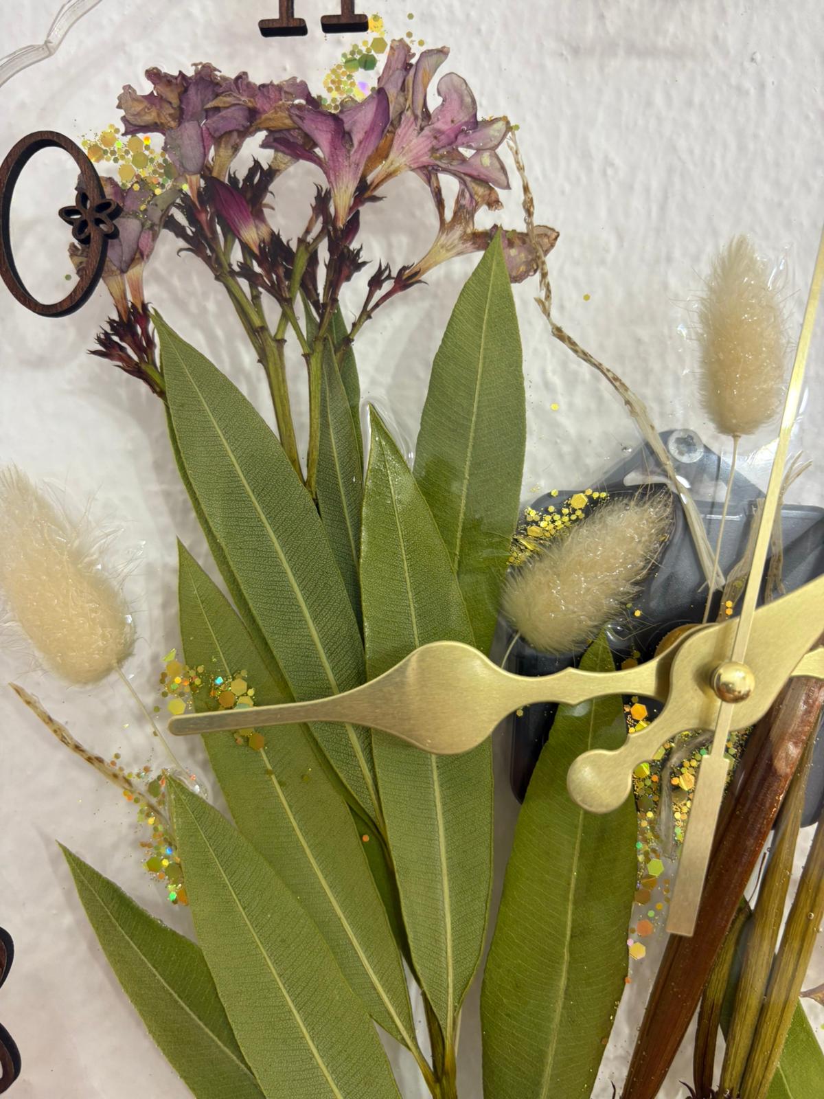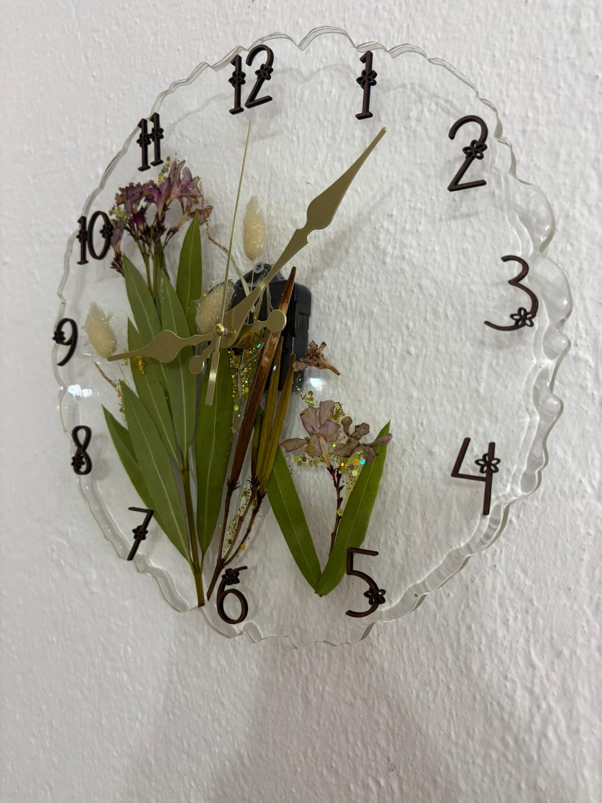 Gerçek zakkum çiçekleri bu saatin içine hapsoldu. Normalde bahçede görsen ?aman dokunma, zehirli? diye uzak durursun ama epoksinin içinde olunca tek zararı zamanı göstermek oluyor.
