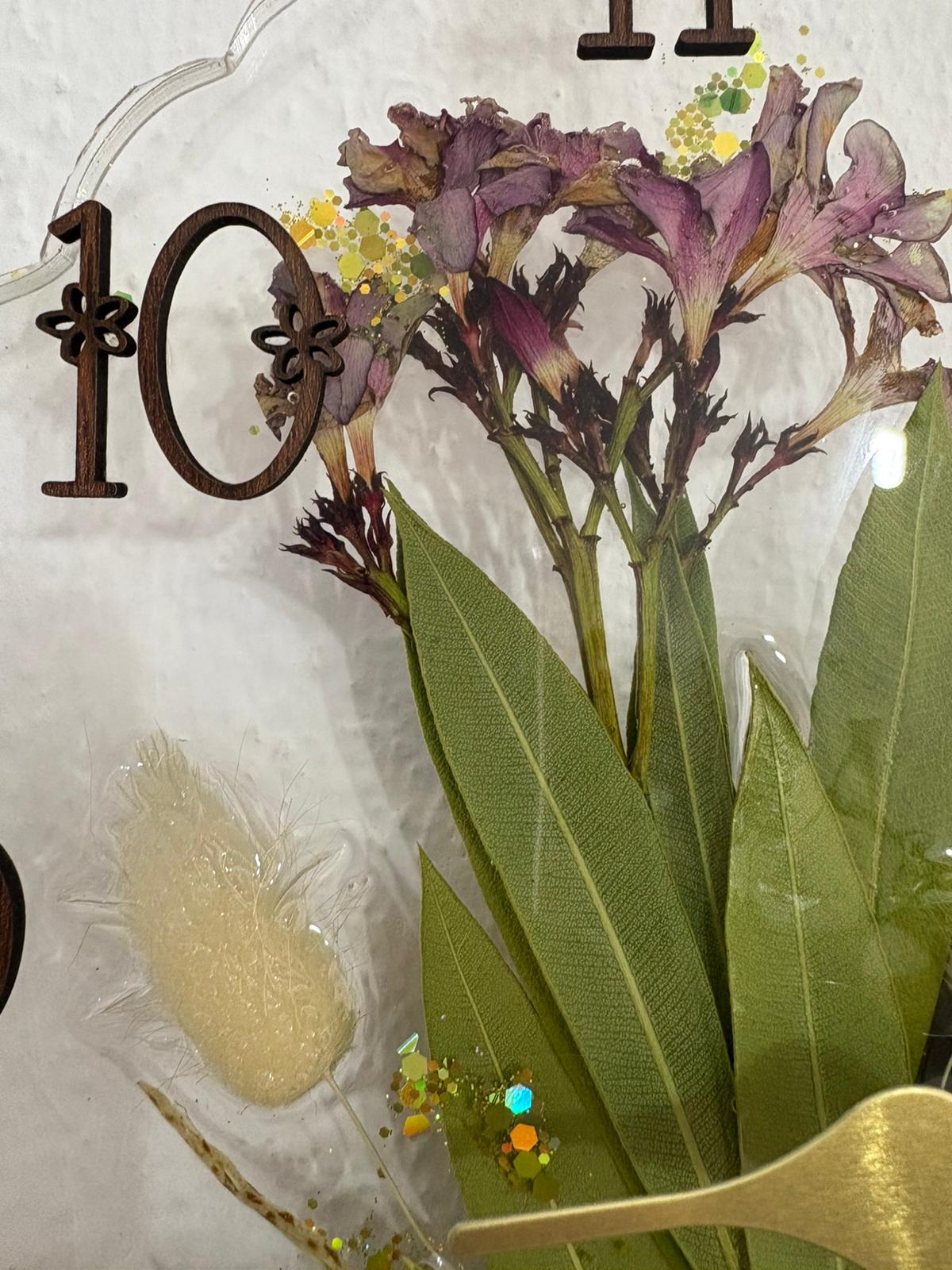 Şeffaf epoksi taban çiçekleri cam fanus gibi saklıyor. Rakamlar gömme değil, yapıştırma. Yani çiçeklere karışıp şov yapmaya gerek duymamışlar, gayet net ?biz buradayız? diyorlar.