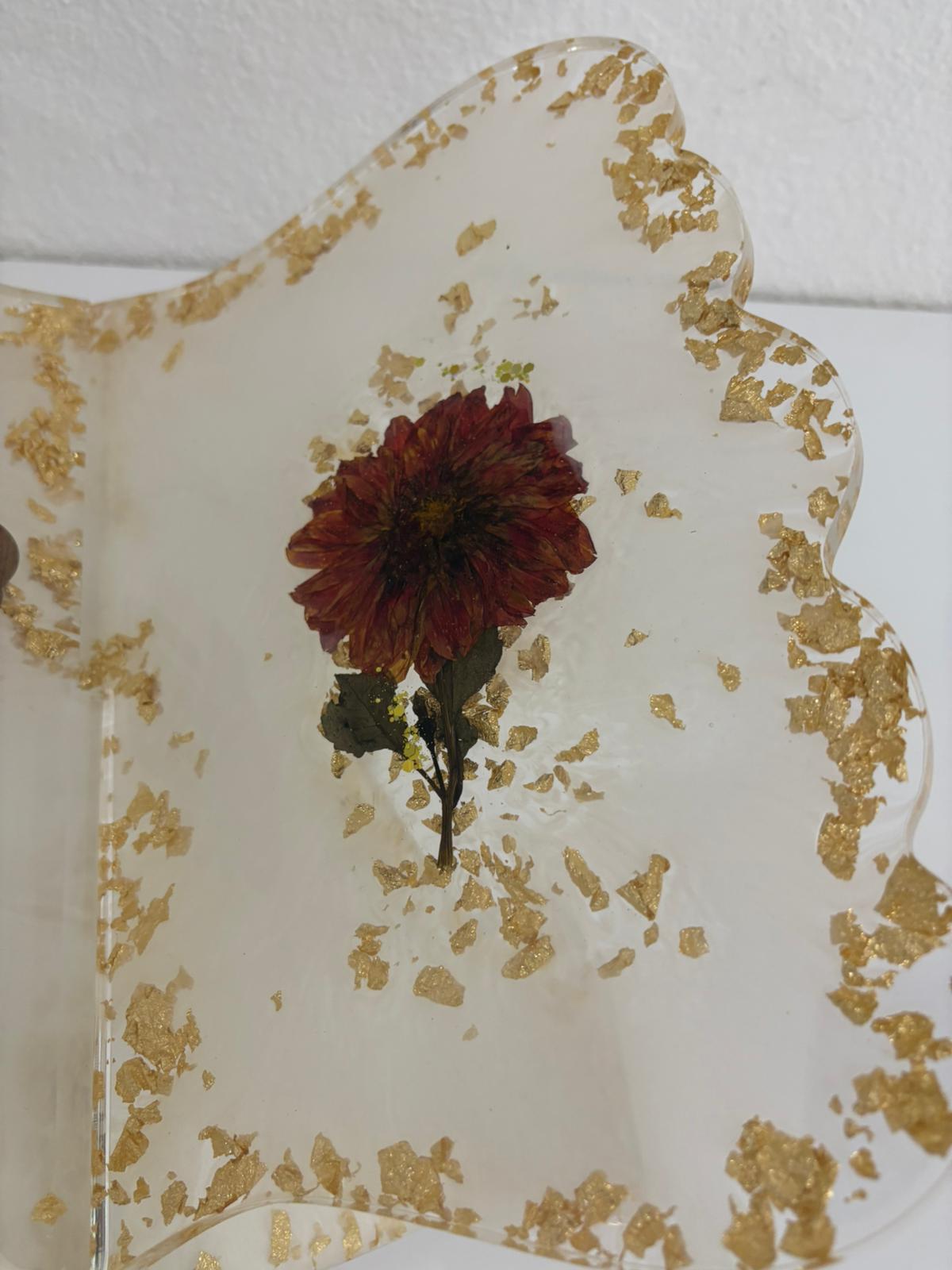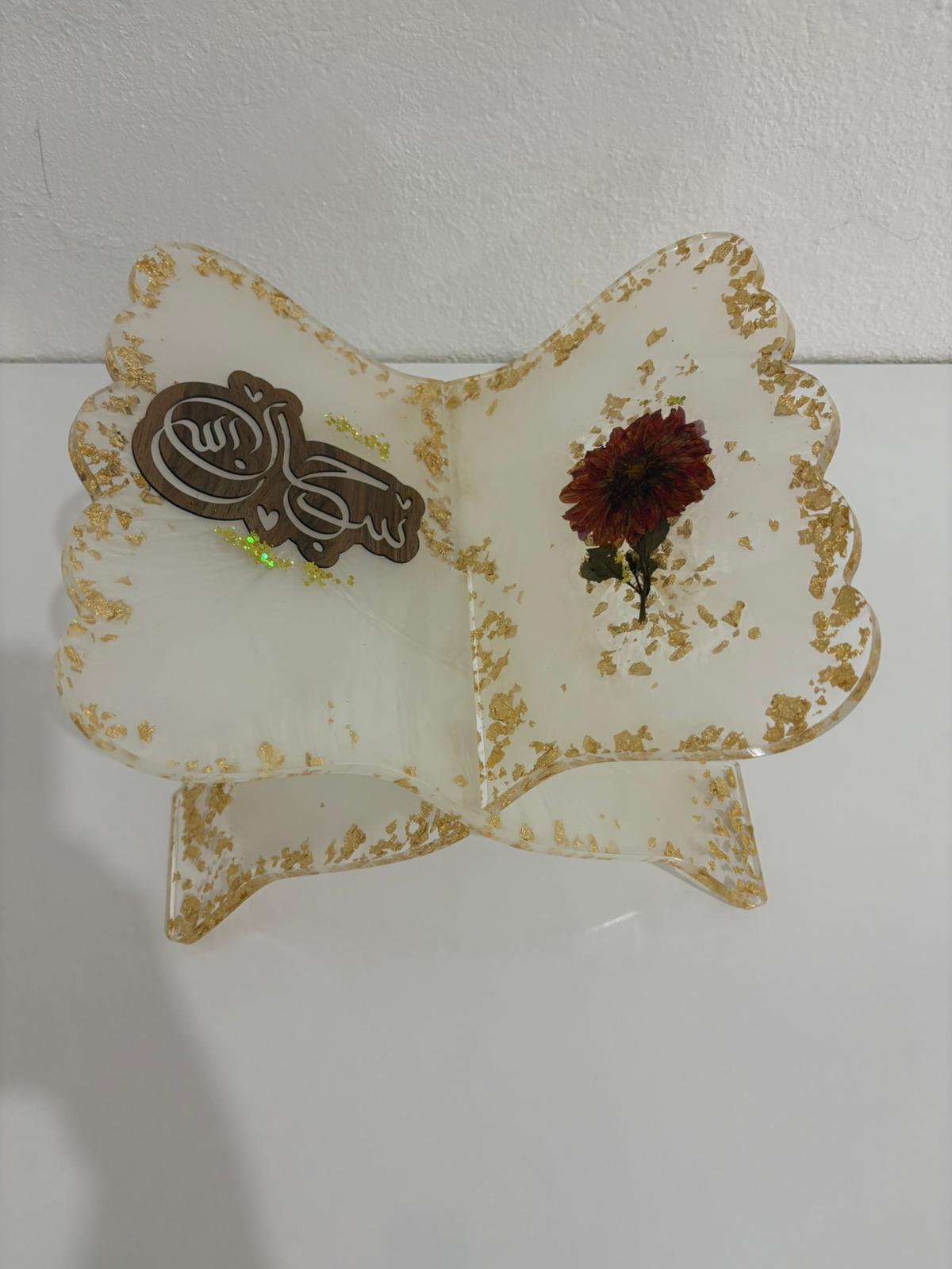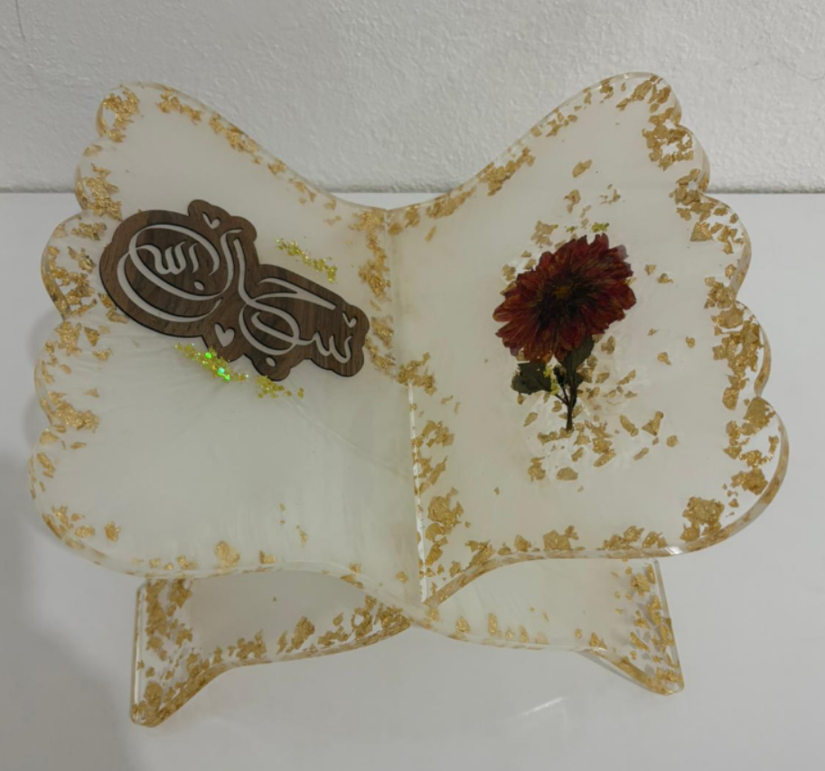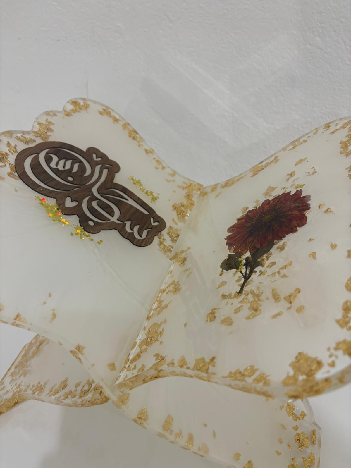 Kelebek formunda şeffaf epoksi rahle. Bir kanadında kurutulmuş çiçek, diğer kanadında lazer kesim yazı motifi bulunuyor. Kenarları altın varak parçalarıyla süslendi, parlak ve şık bir görünüm kazandı.