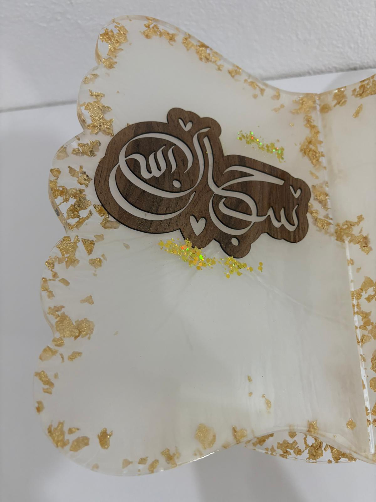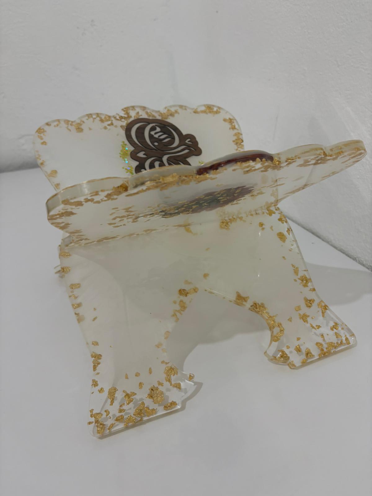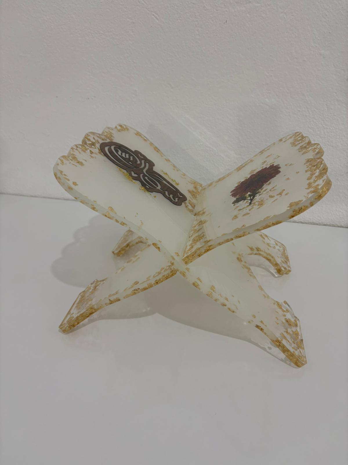 Kelebek formunda şeffaf epoksi rahle. Bir kanadında kurutulmuş çiçek, diğer kanadında lazer kesim yazı motifi bulunuyor. Kenarları altın varak parçalarıyla süslendi, parlak ve şık bir görünüm kazandı.