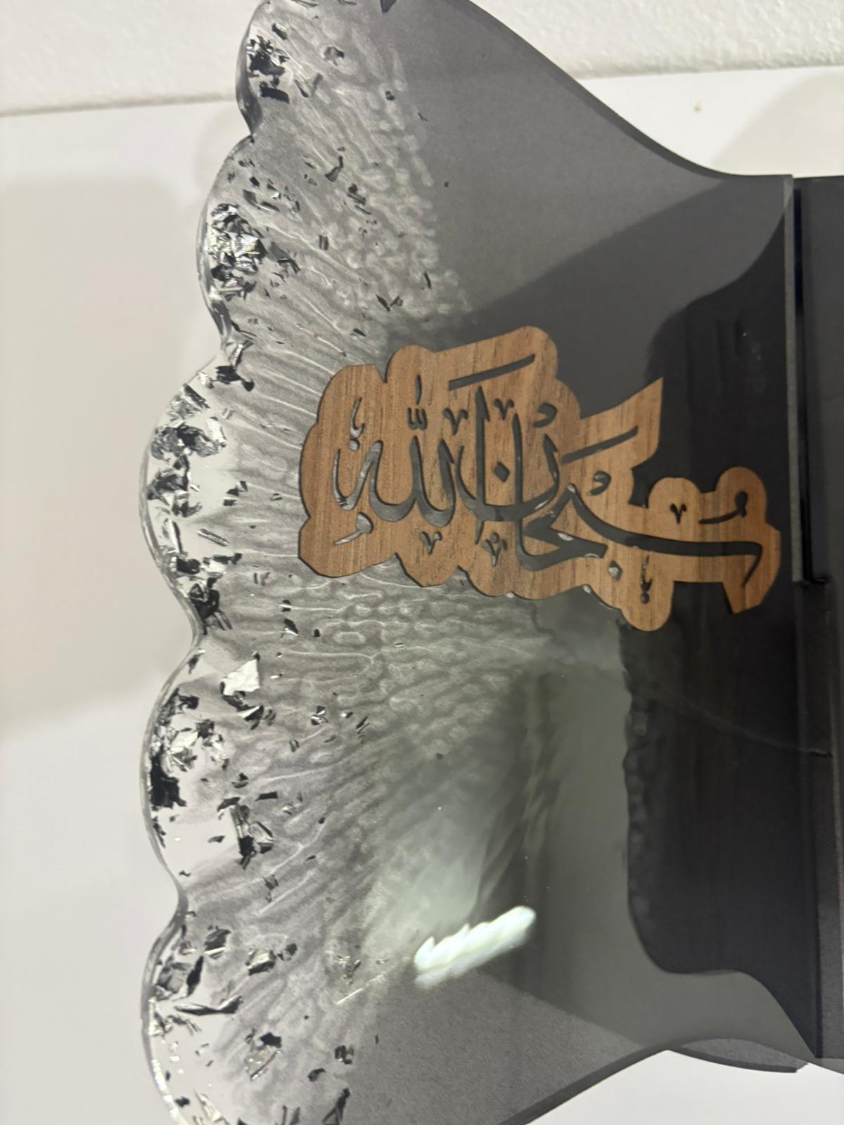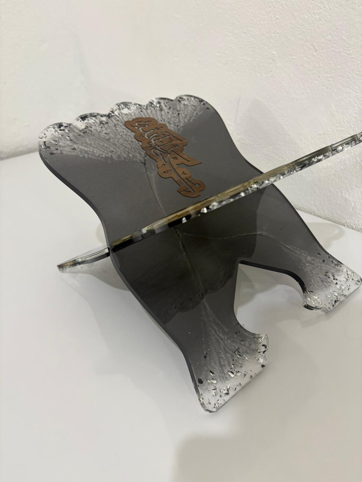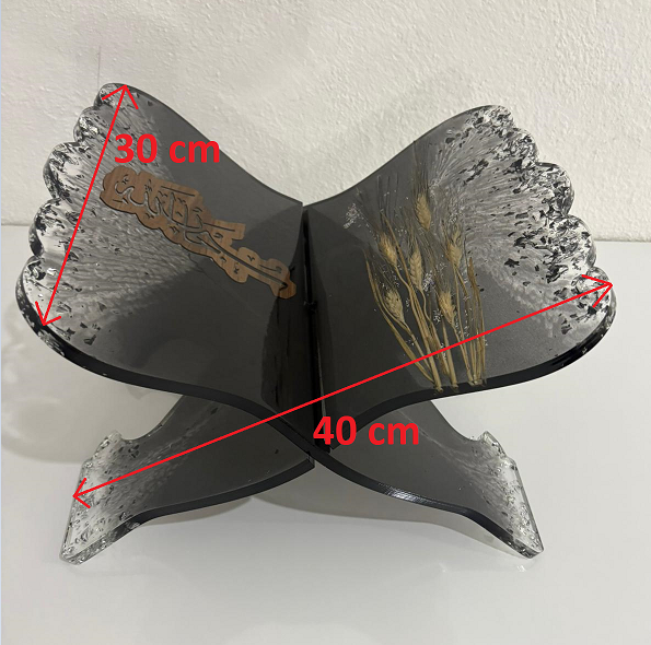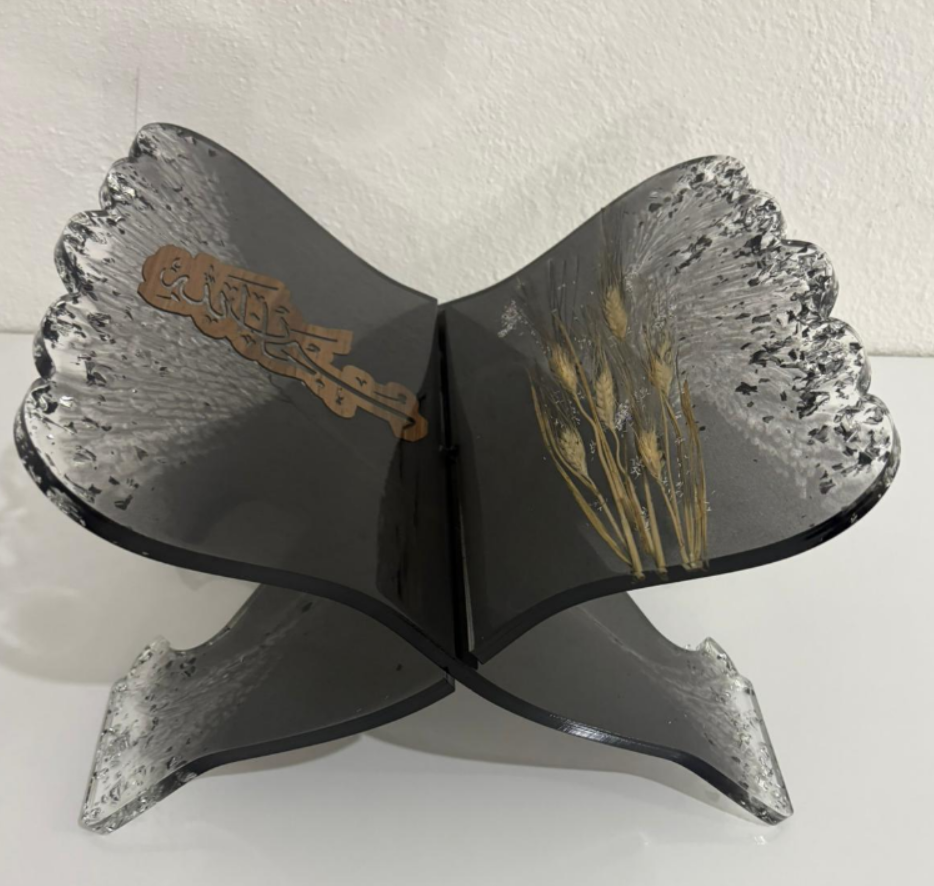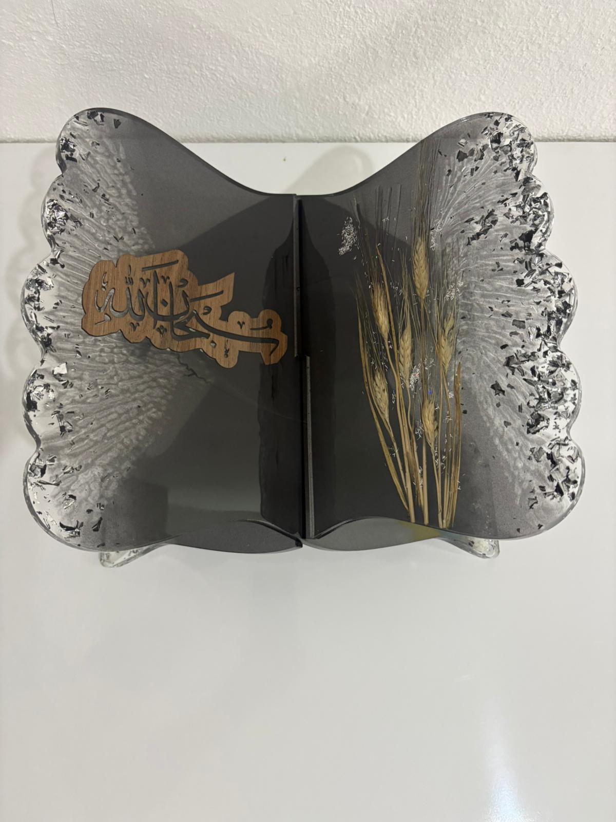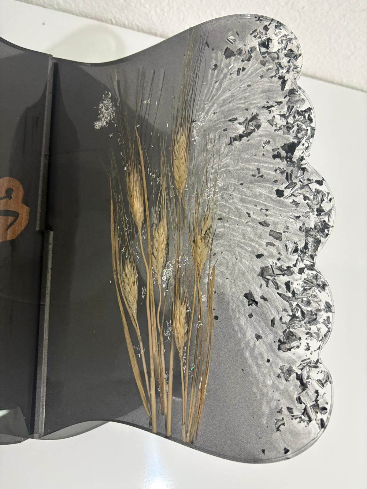 Büyük boy, kelebek formunda siyah epoksi rahle. Kanatların birinde kurutulmuş başak demeti, diğerinde ise lazer kesim yazı motifi bulunuyor. Gümüş varak parçalarıyla tamamlanan tasarım, hem doğal hem de modern bir duruşa sahip.